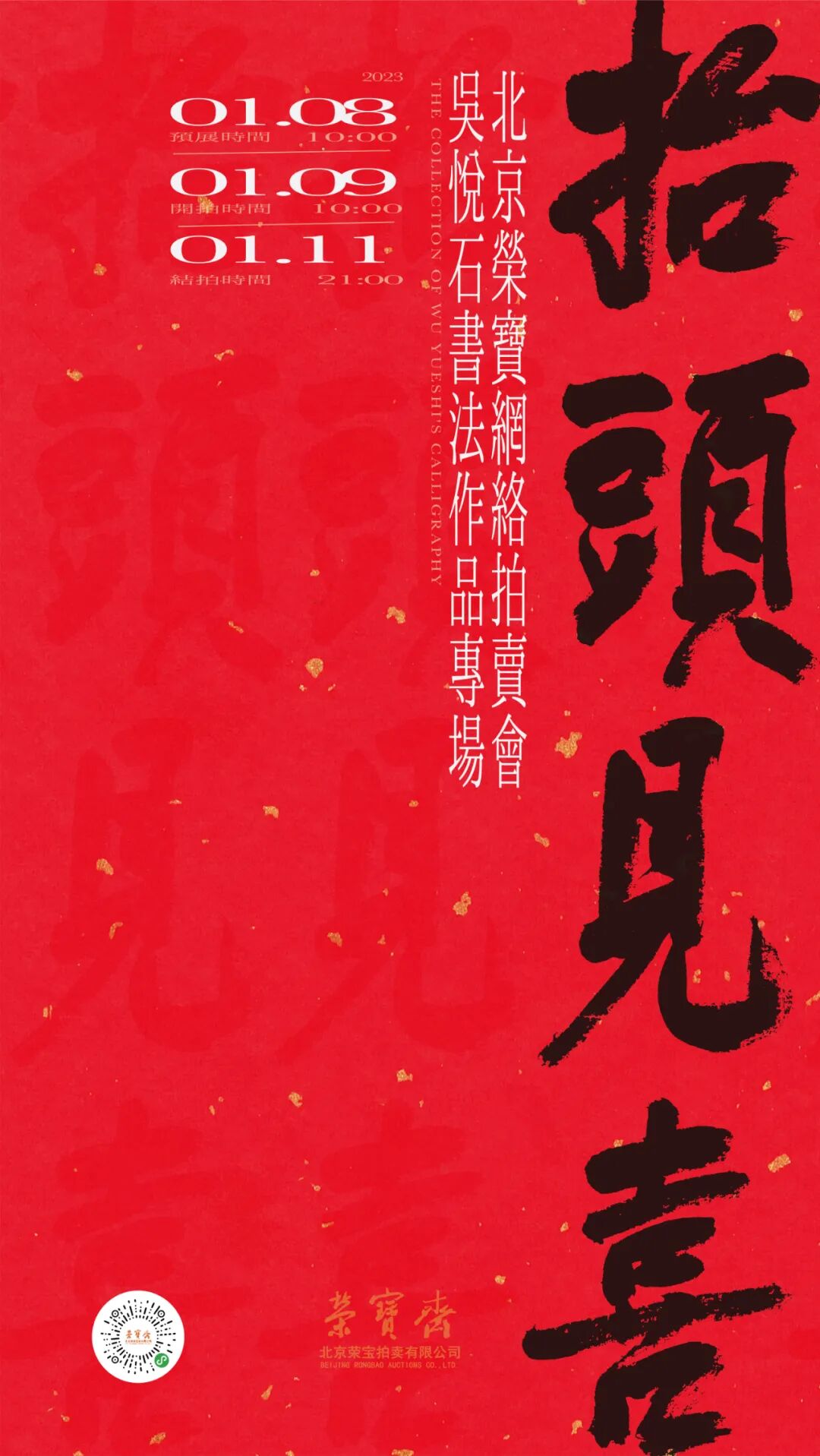 北京荣宝——抬头见喜·吴悦石书法作品专场网络拍卖会将于1月8日10:00—1月9日10:00开启线上预展,并于1月9日10:00开拍,1月11日21:00结拍。