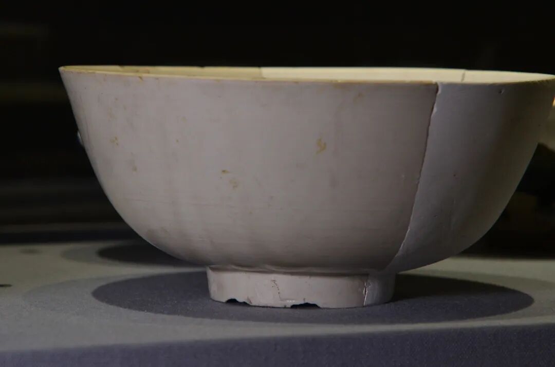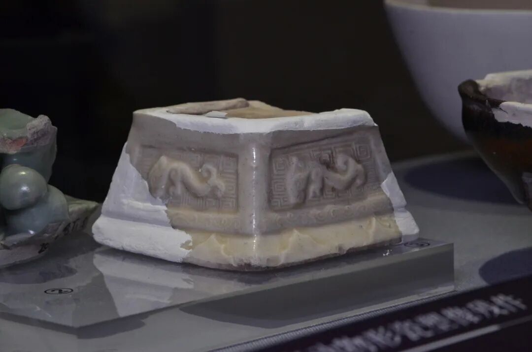展览中所展出的一件景德镇青白釉瓷碗,为广东南海一号沉船遗址出水。该碗敞口,浅腹,里外壁满釉,釉质莹润。碗内刻划婴戏莲纹,线条流畅,纹饰清晰。它不仅釉色精美,碗内壁刻划的婴戏纹是宋元时期北方地区流行的婴戏纹,景德镇窑将其吸收后运用在自己的产品中,体现了南北方制瓷业之间的影响与交流。