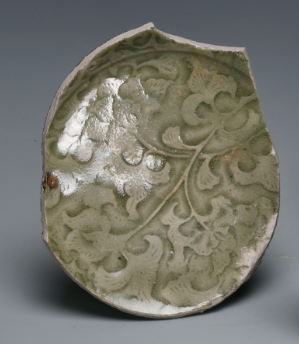 耀州窑,位于今陕西省铜川市境内,唐代时便以生产青瓷而著称,北宋时期成为北方青瓷烧造中心,其产品以犀利的刻花装饰而闻名,早在比宋时期便与浙江地区的越窑、龙泉窑产生了制瓷工艺的借鉴、交流,对于越窑瓷器的刻花装饰具有一定的影响。作为北方地区烧造青瓷的代表窑场,其产品在临安城遗址中发现数量虽不及定窑白瓷,但临安城及周边一些遗址中亦发现了高质量的耀州窑青瓷。