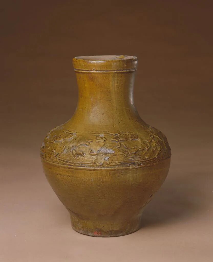 绿釉凸花狩猎纹陶壶,东汉,高25厘米,口径9.8厘米,底径10.2厘米。壶撇口,粗颈,鼓腹,胫部渐收,平底。灰白色胎。通体施绿釉,釉色匀净光亮。腹部凸雕狩猎纹,可见林中飞奔的龙、虎、羊等。