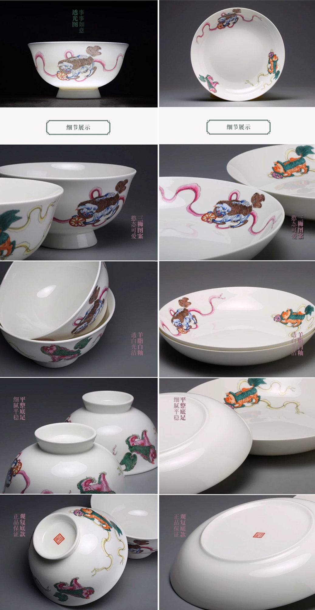 三狮各有神韵、憨态可掬;羊脂白釉透润如凝脂、碗盘兼备,乃家居生活之实用器▼
