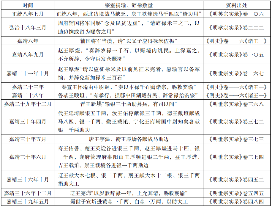 忧国,即指为国事而忧虑。国事,即国之大事,也可理解为国家治理的大事。而财政在国家的治理中起着基础性和支柱性的重要作用,自然当属国之大事无疑。明代自中叶始,即发生了财政危机。嘉靖中期,明朝财政危机已发展到非常严重的地步,“帑藏匮竭”,入不敷出。[3]很多宗室对此表现出极大的忧虑,纷纷捐输资金、财物,请求减禄、辞禄,欲以一己之财力弥补国家财政紧张于万一,尽现一片赤诚的忧国之心。明代宗室捐输、辞禄的事例较多,约有120人次。为行文的简洁、方便,谨按其捐输、辞禄的时间先后顺序,列表如下。