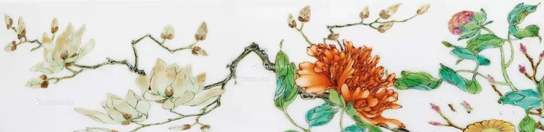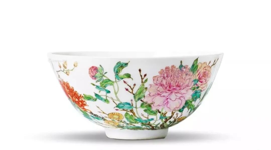 2019年一款清雍正粉彩“玉堂富贵”花卉纹碗以747.5万高价为藏家所竞争得。此碗敞口,斜腹,圈足。外壁主体绘有两朵交叠掩映的粉红色牡丹,娇艳欲滴;玉兰花枝伸展至一侧,或含苞,或盛放;枝叶中间有浅橘色的雏菊,甚为可爱。底青花双圈内书“大清雍正年制”楷书款。