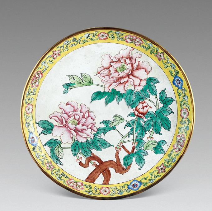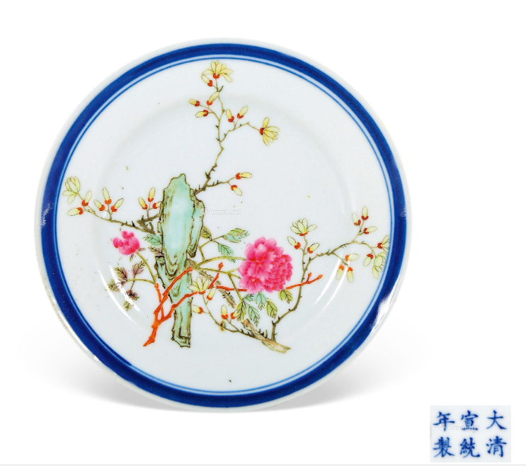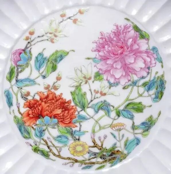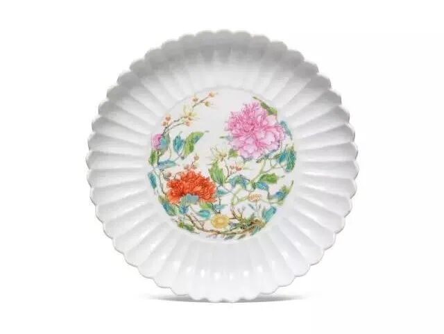 此外,2016年北京东正拍卖会上,一只清雍正粉彩“玉堂富贵”图菊瓣盘也以800万成交。此器敞折沿,器腹菊瓣状,矮圈足,盘型周正,胎薄体轻,釉质白润。盘心绘製两株牡丹横敧而开,玉兰、雏菊穿插其间,象征玉堂富贵、杞菊延年之意,牡丹之造型、色彩为清初恽南田传派画法,当出自雍正朝恽派宫廷画家蒋廷锡、邹一桂之画稿粉本。