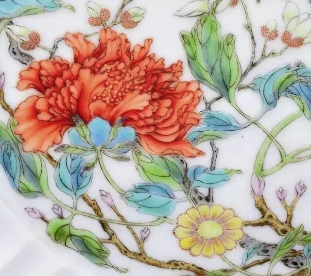 雍正朝宫廷作坊中凡有花卉题材,均是工笔写真,形神俱佳,气韵清雅脱俗。盌上所绘之牡丹、玉兰、雏菊,色彩淡雅逸丽,运笔自然流畅,层次清晰,阴阳向背,栩栩如生。
