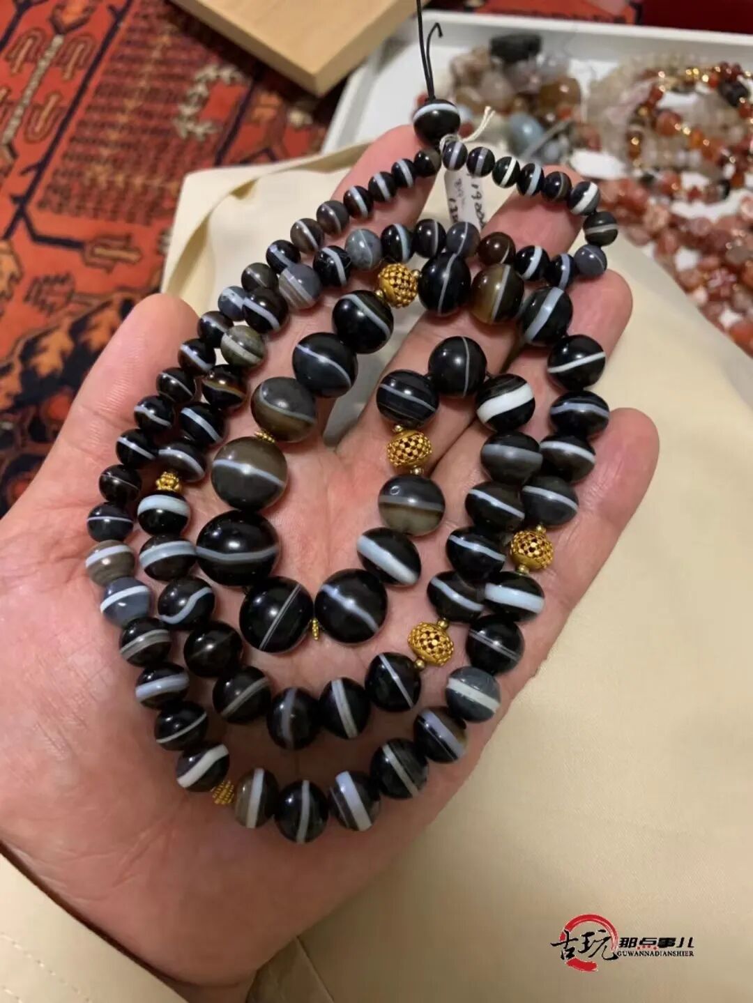 那么天珠究竟是什么?我的理解,天珠的材质是来源于喜马拉雅山域的一种玛瑙质矿石,最好的是接近羊脂玉一般的乳白色,其次是象牙黄色,再次是比较通透的普通玛瑙质地,一般都没有或较少玛瑙纹。天珠的产地是在印度阿富汗一代的中亚地区,通过一些天然药物再经高温,刻意将黑色和白色深入玛瑙内,绘制出一些简单图饰,眼纹和波浪纹是最常见的,但这些眼和波浪以及其他线条究竟代表什么含义,没人能弄清楚,拉萨河老师认为是远古生殖崇拜,但我没机会听到他的详细解释。虽然现在我们把天珠和佛教结合在一起,用佛教的教义来解释天珠的各种纹饰,但是,我们必须记住,天珠是佛教之前的产物,甚至是早于佛教的苯教之前的产物。藏地全民信仰佛教,天珠作为财宝大多被供奉于佛前或直接镶嵌在佛像里,由于藏地资源稀缺,基本不陪葬(早期有过墓葬习俗),家庭内的天珠作为最重要财产代代相传,经千百年来虔诚佛教徒的摩挲传咏,的确汇聚天地灵气,能让人一见倾心。目前遗存的真天珠一般分为至纯和旁系,主要由材质和纹饰来区别,至纯大多流传在藏地,而旁系大多流传在印度阿富汗地区,完整至纯天珠的存世量,各方说法不一,但我感觉“不超过一两万颗”的说法比较靠谱。至于天珠的护身功能,那是见仁见智,只有靠自己去佩戴体会。对于个人的福祸,我更倾向因果,所谓“菩萨畏因,凡人畏果”,只是看得明做得到的人不多罢了。
