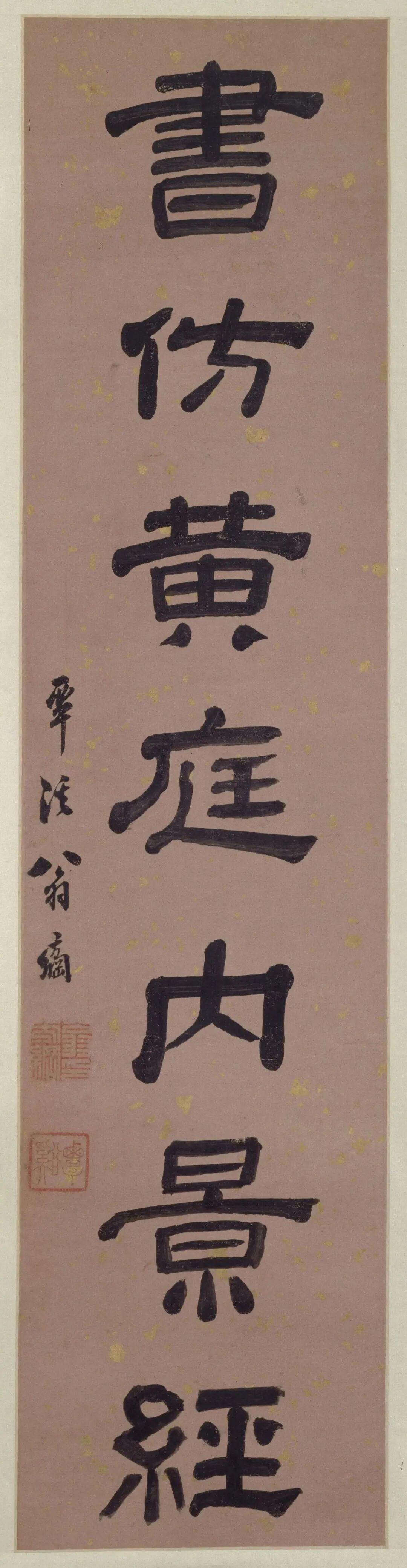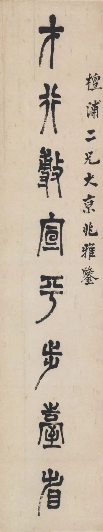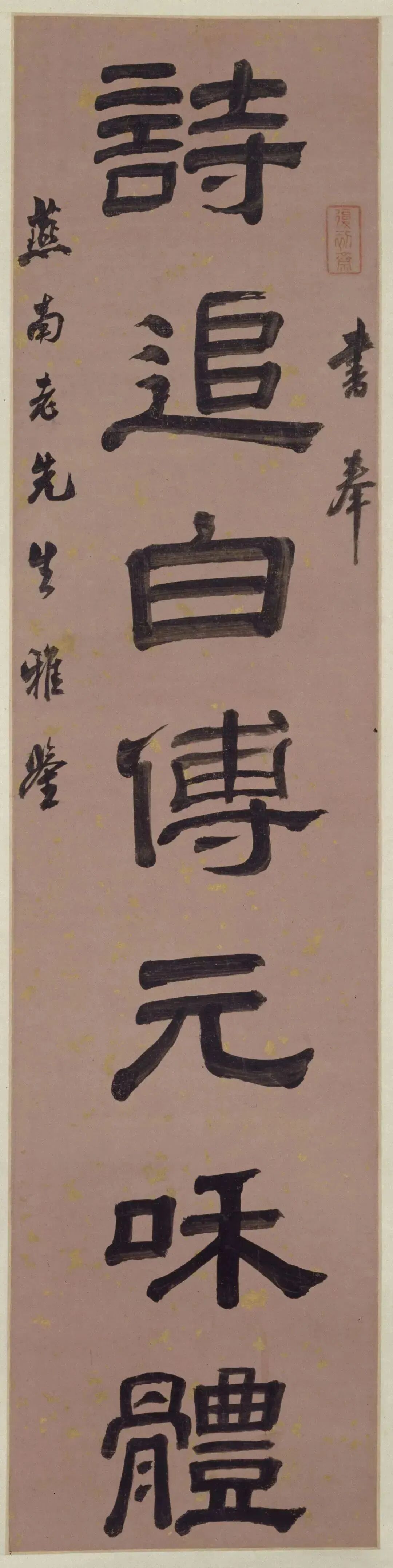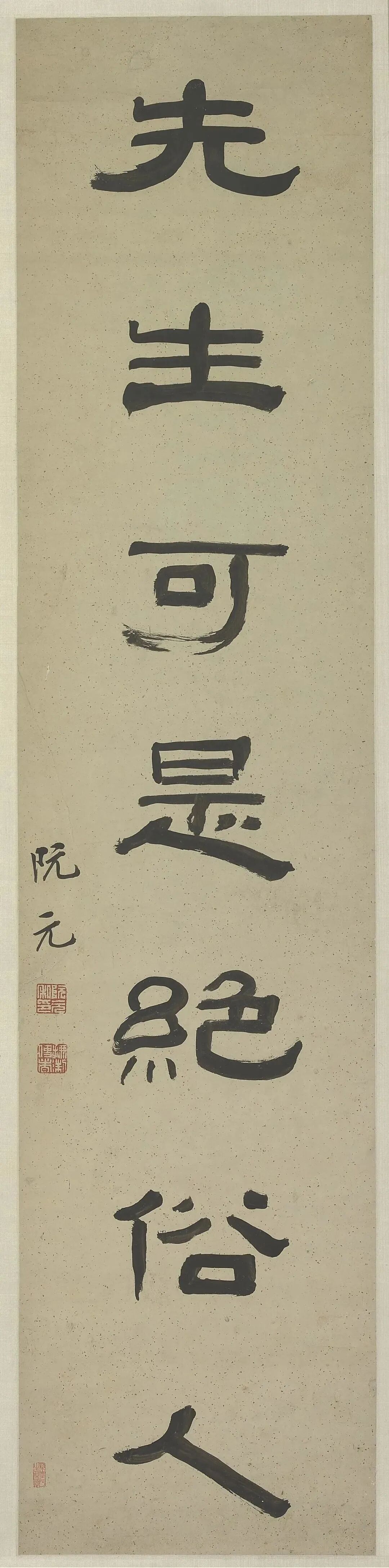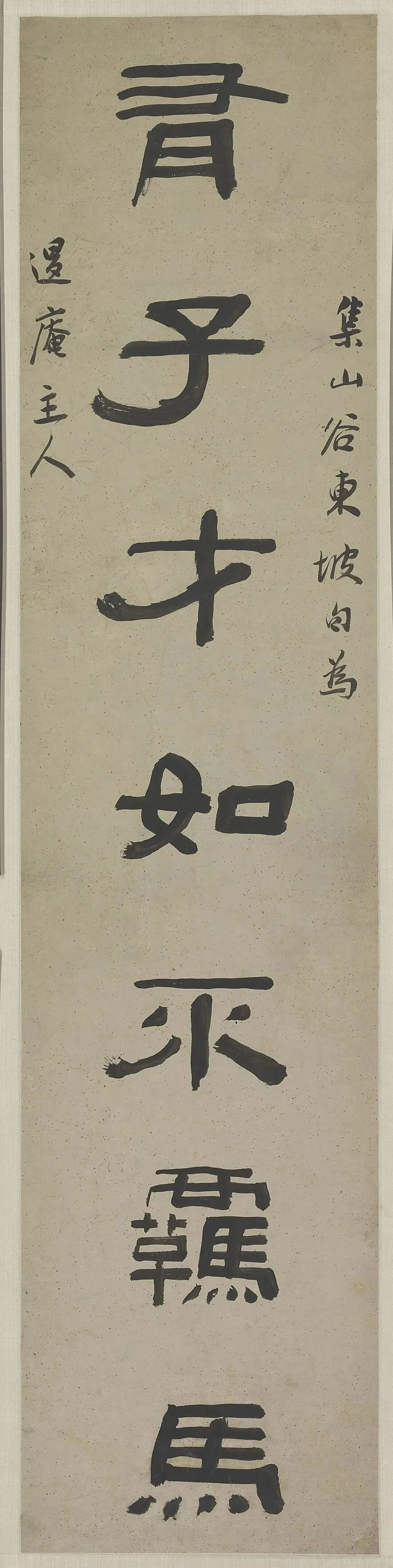 阮元著有《南北书派论》和《北碑南帖论》,将书法分为南北两派,即以二王为核心的帖派与以北朝碑刻为核心的碑派,开启“扬碑抑帖”的先声。此联用笔浑厚率直,笔锋不假修饰,回转波挑,飘逸灵动,风格古朴自然。“退庵主人”即嘉道著名官员、文人学者梁章钜,与阮元交情深厚,富藏金石碑拓与图书,精鉴赏,著有《楹联丛话》《退庵所藏金石书画跋尾》等数十种。