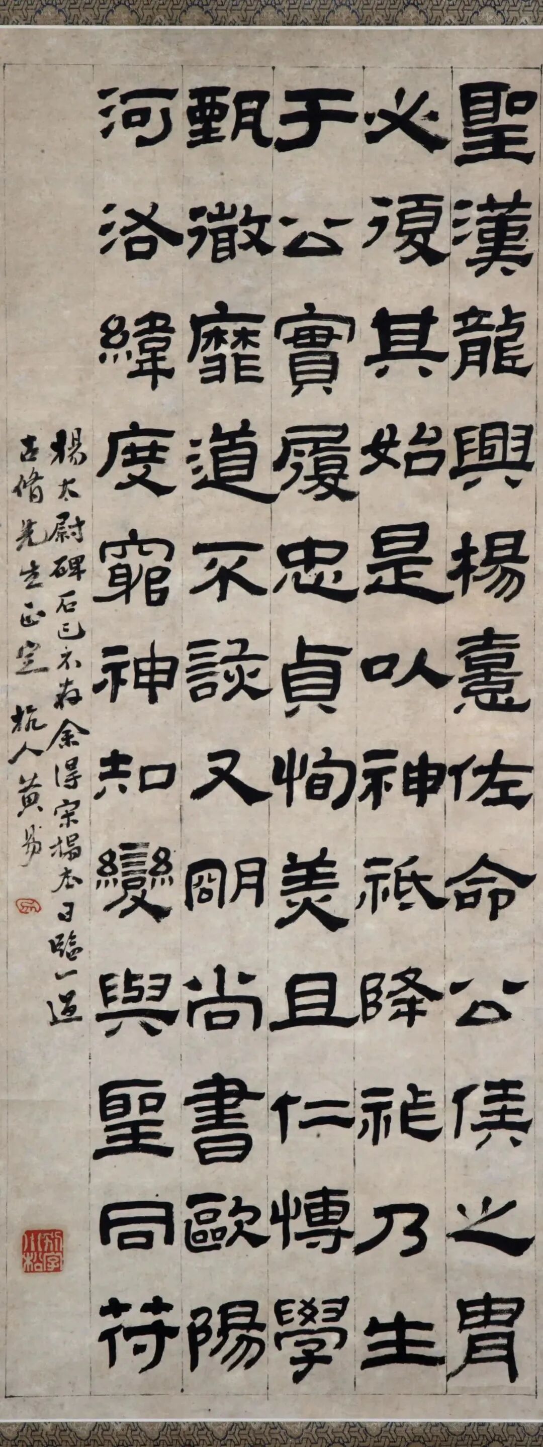 释文:圣汉龙兴,杨憙佐命。公侯之胄,必复其始。是以神祗降祚,乃生于公。实履忠贞,恂美且仁。博学甄微,靡道不该。又明尚书欧阳河洛纬度。穷神知变,与圣同符。杨太尉碑石已不存,余得宋搨本,日临一过。子修先生正定。杭人黄易。