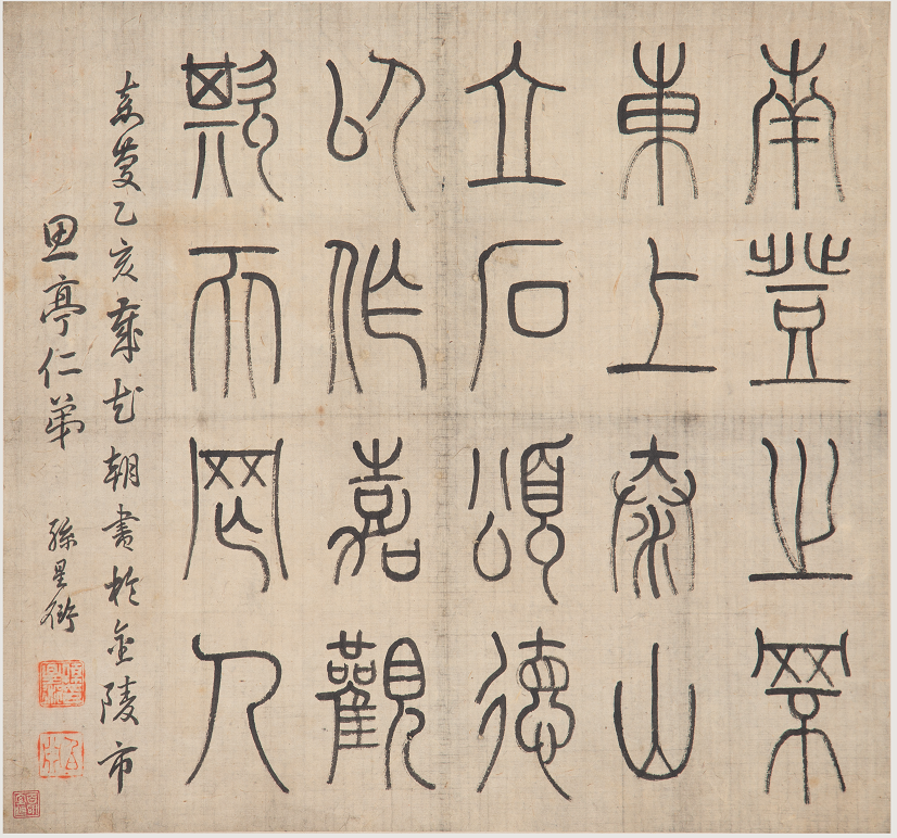 孙星衍书法以篆、隶二体最工,直追秦汉。篆书精妙圆润,工稳遒劲。商承祚在《我和古文字学》中称:“八九岁时,见书斋悬有孙星衍篆书联,喜其笔势缭绕美观,结体匀称,在不断瞻仰下,或指划肚揣摩其文,或临摹以肖其形。”可见其篆书对商承祚的深远影响。
