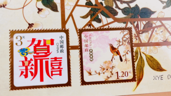 “贺6”《春和景明》邮票采用古画画面设计,画面上有一只报春鸟站在一枝盛开鲜花的树枝上,寓意春光和煦,风景明丽。