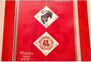 “贺16”虎年贺年专用邮票,包含“任寅大吉”和“五福临门”两枚,
