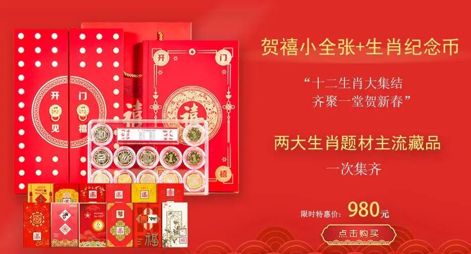 《开门见禧》囊括12张贺禧小全张贺年专用邮票,以及12枚生肖纪念币,收藏价值和升值潜力可想而知。