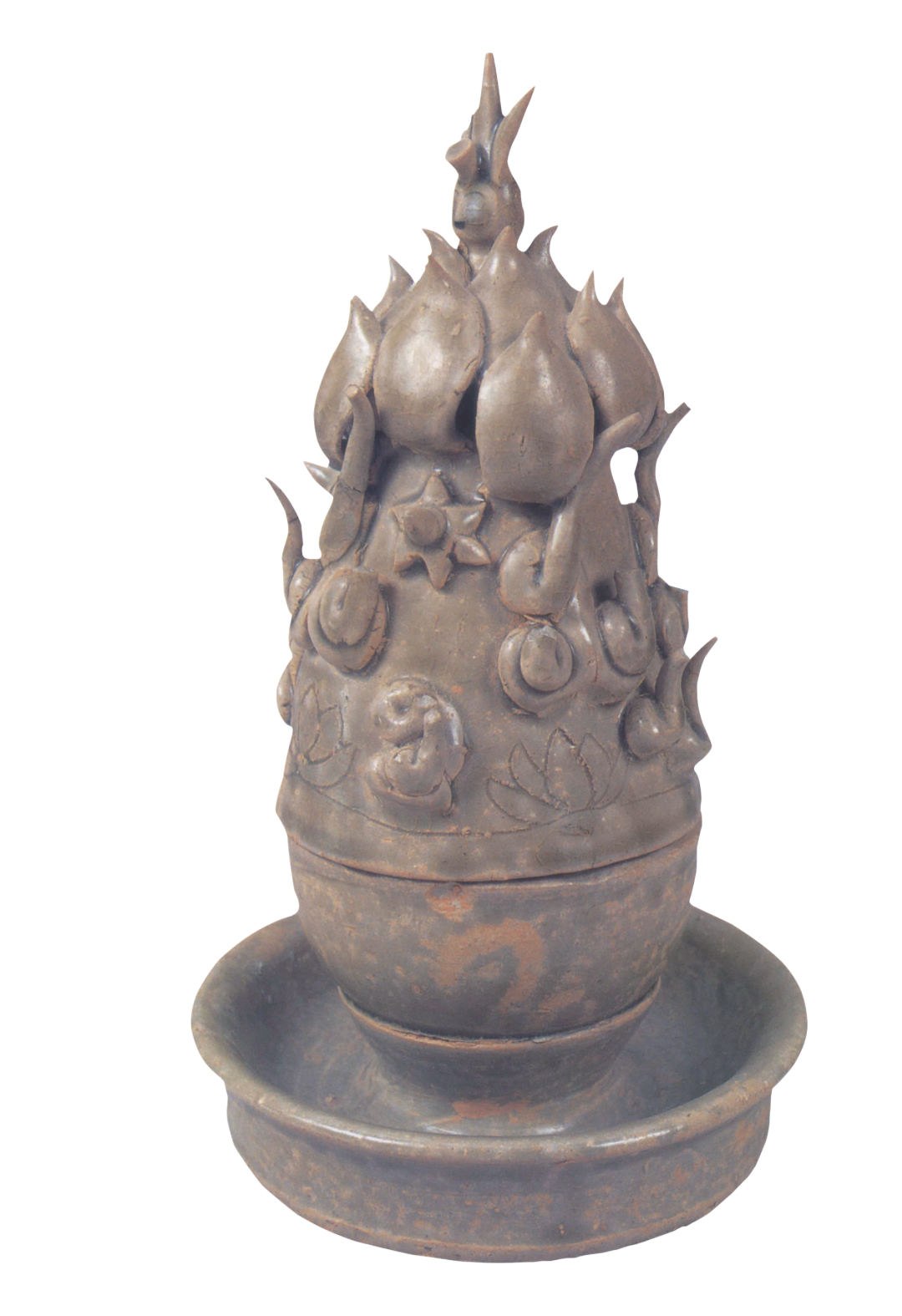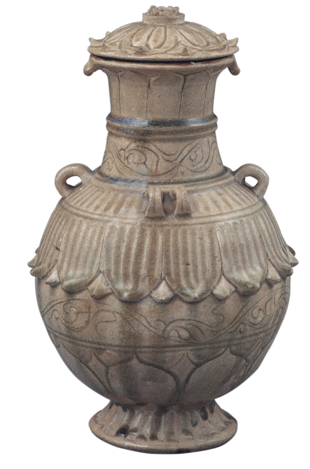 这件四系罐上腹部所饰十一瓣覆莲为单层,较为简洁;装饰繁复者,如形体较大的莲花尊,仰莲与覆莲相向或相背接合,且多层叠压,显示出极高的工艺水平。