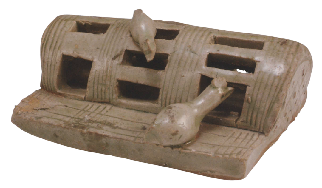 鸡首壶、兽形尊、香熏、兽形水注、三足砚、唾壶、虎子和羊形器等日用器以及灶、谷仓罐、猪圈、鸡舍等模型器都是此时期的特色产品。堆塑人物、飞鸟、百兽、楼阁等内容的谷仓罐是魏晋时期青瓷高水平的艺术杰作。
