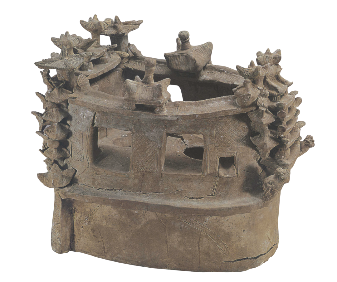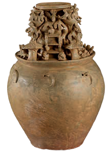 由于其形象与盛储五谷的粮仓有关,故江浙一带多称之为“谷仓”。这类明器的用途,应与两汉随葬谷物的传统相关;更有学者指出,罐顶楼阁与罐体水生物、孔洞等,分别为墓主灵魂居所与地下黄泉世界的表现。