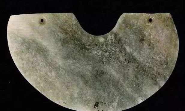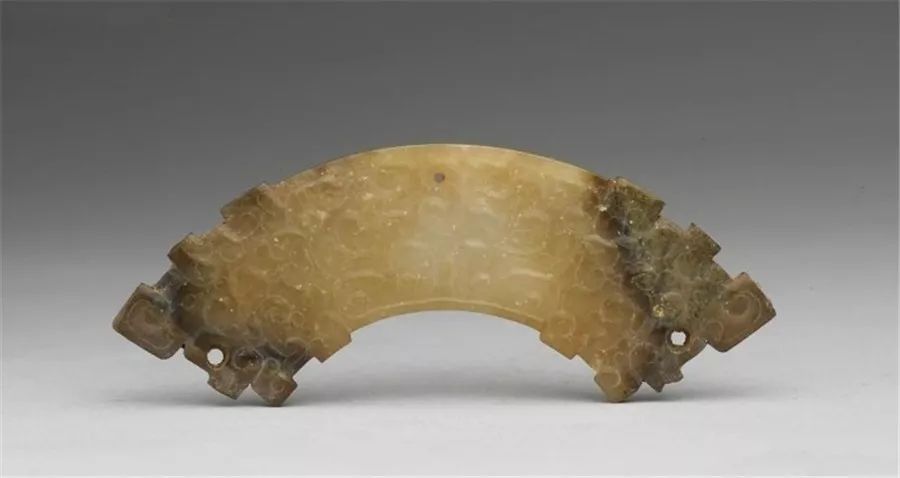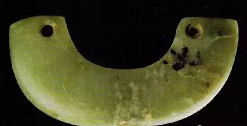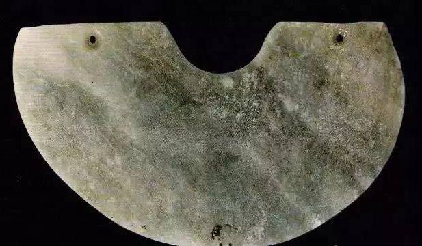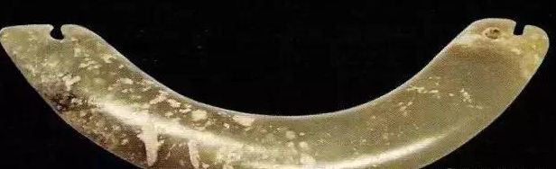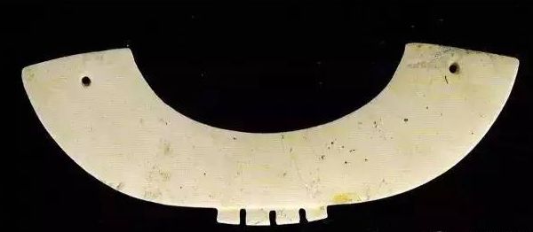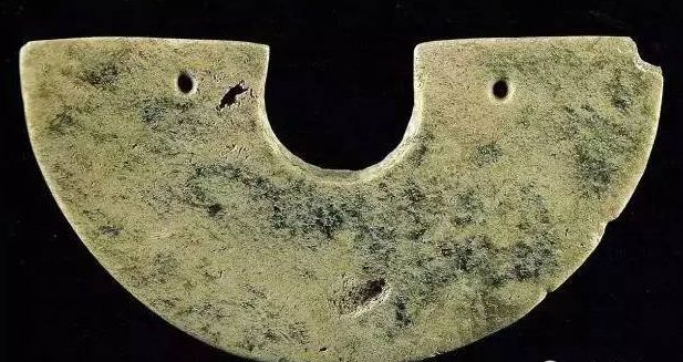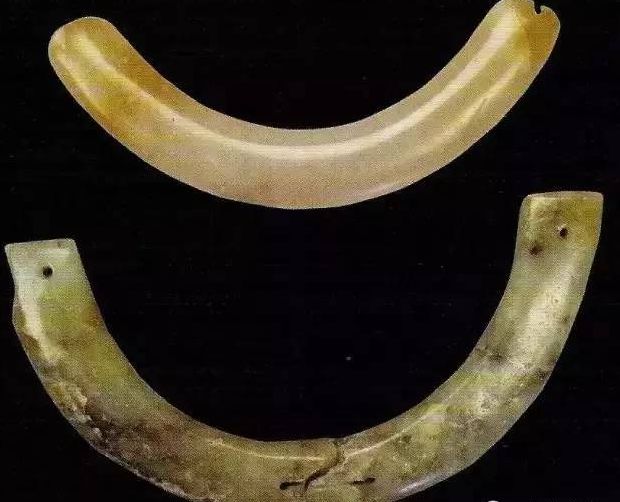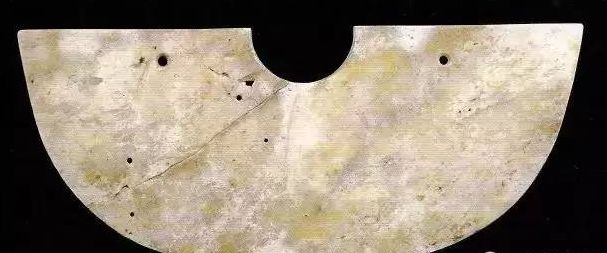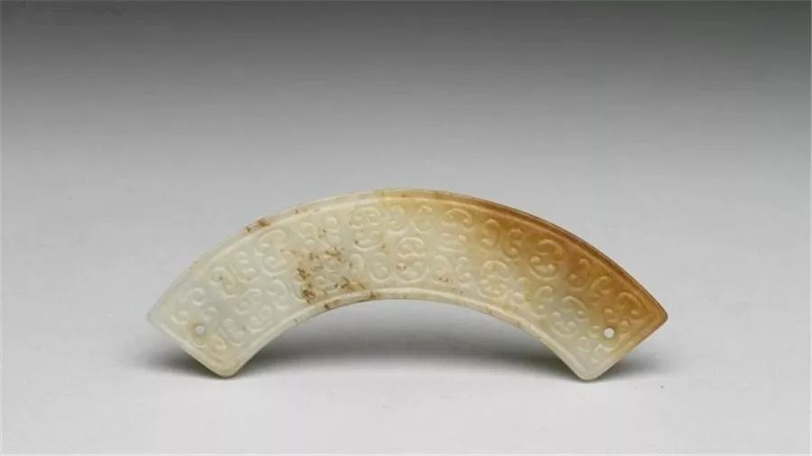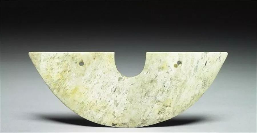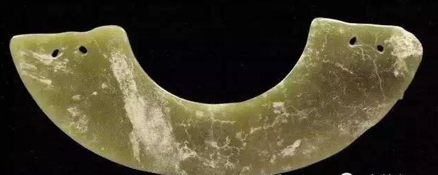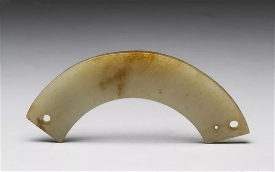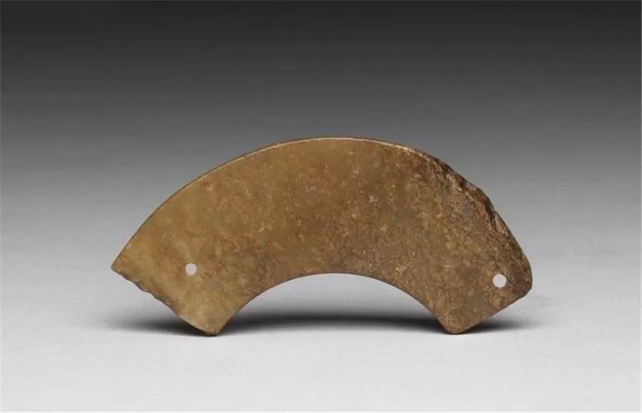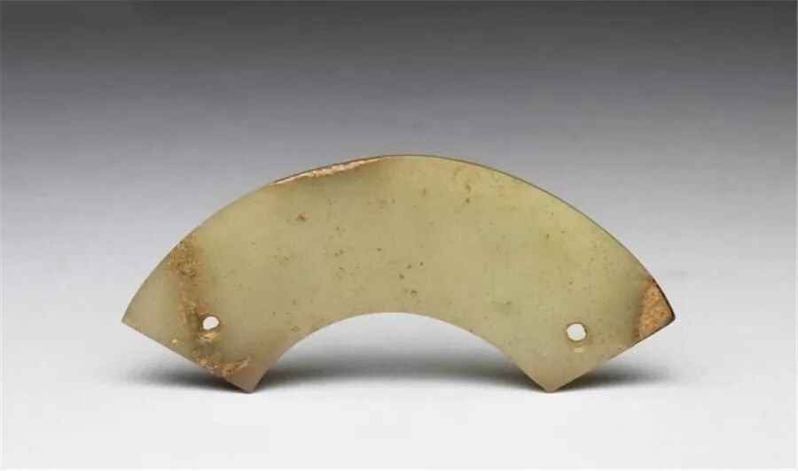 玉璜最早见于新石器时代中期的仰韶文化、大溪文化、崧泽文化遗址中,形制有扇面形、半环形、桥形、半月形、近半月形、近半圆形、条形等,不一而足,两头各钻二孔,均为素面。