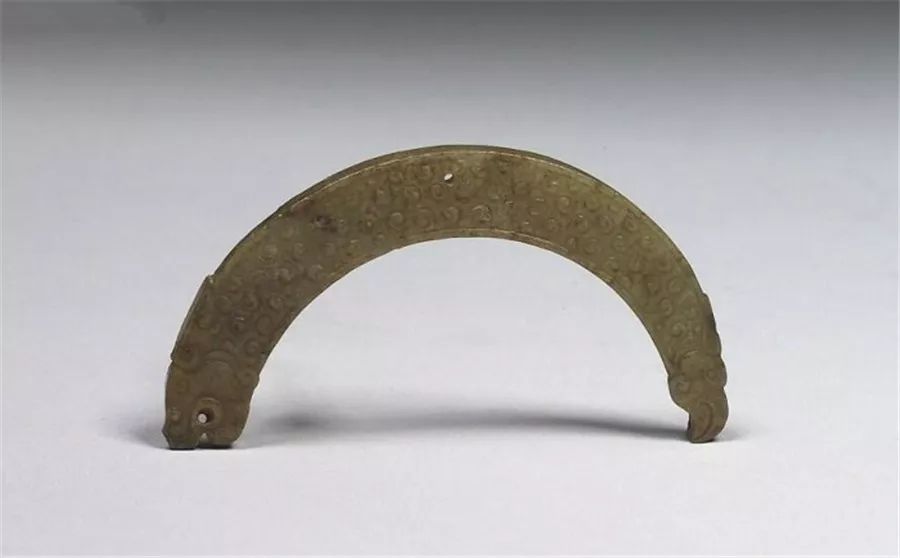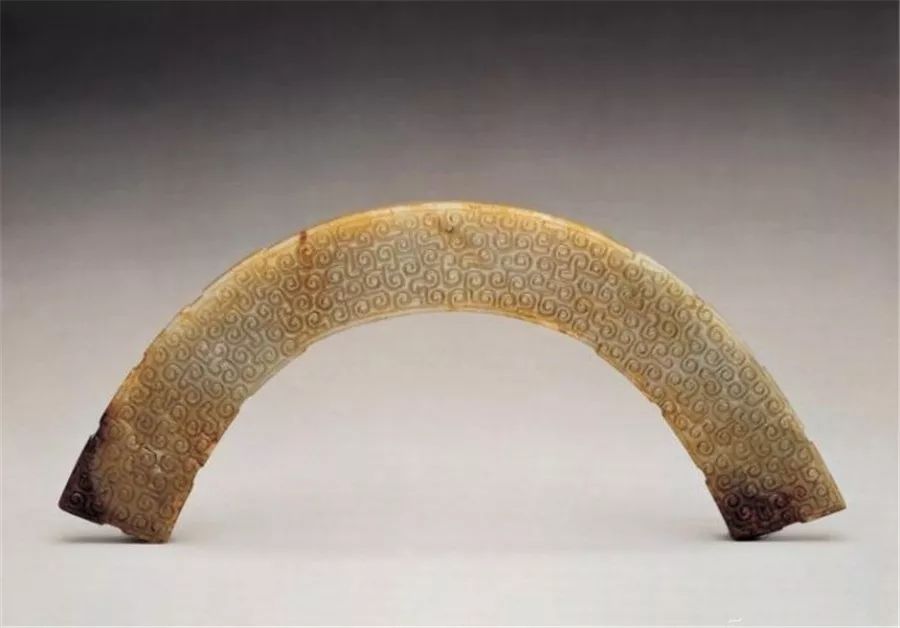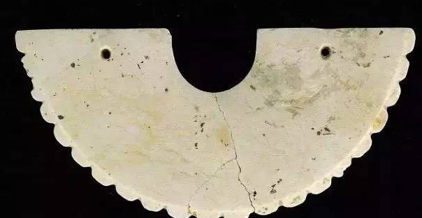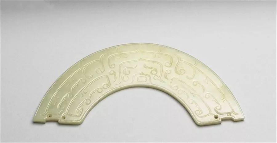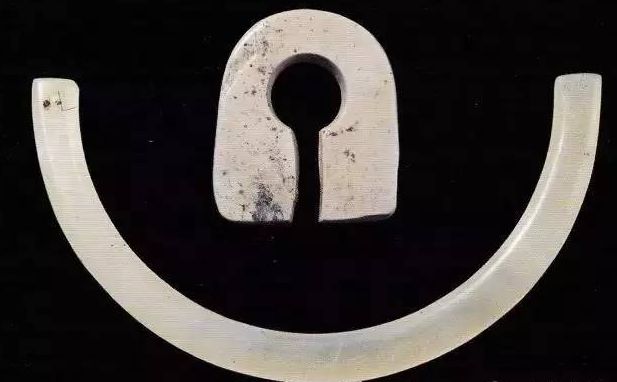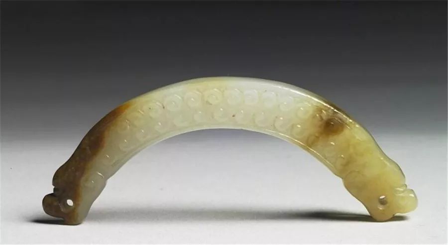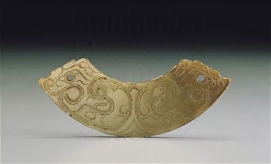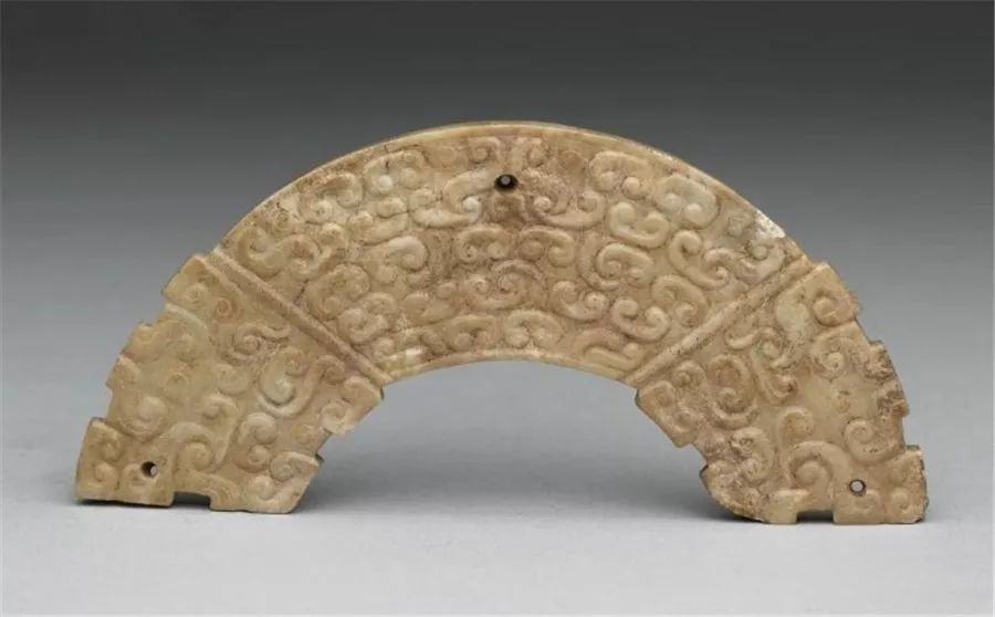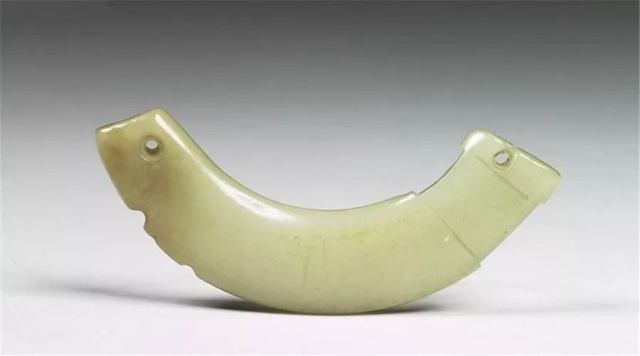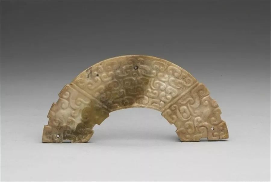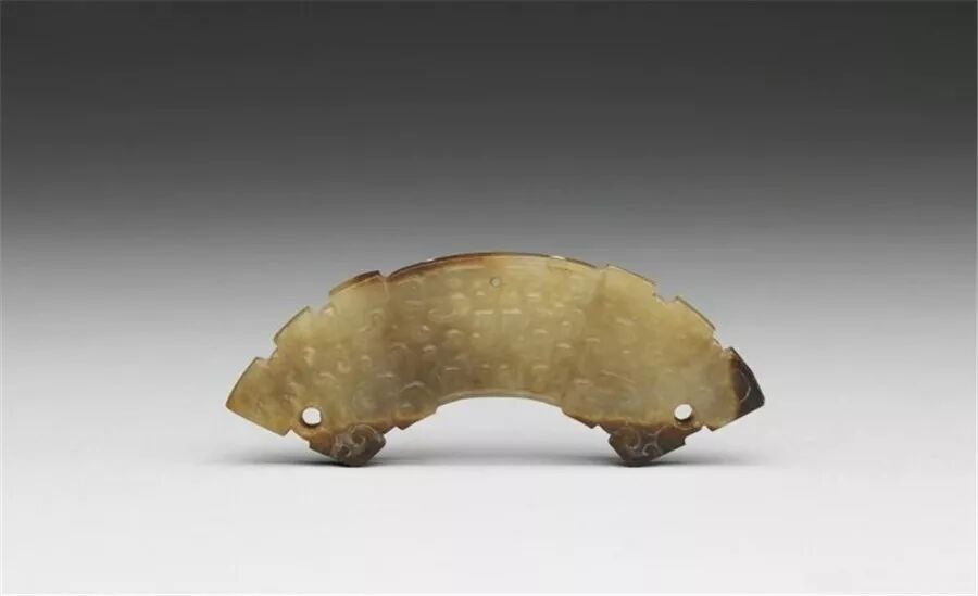 玉璜最早见于新石器时代中期的仰韶文化、大溪文化、崧泽文化遗址中,形制有扇面形、半环形、桥形、半月形、近半月形、近半圆形、条形等,不一而足,两头各钻二孔,均为素面。