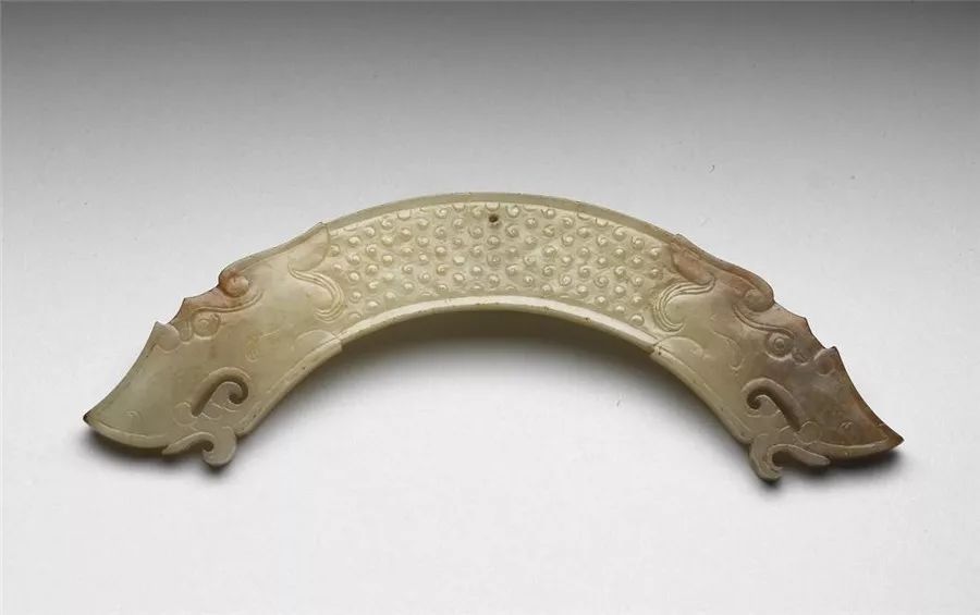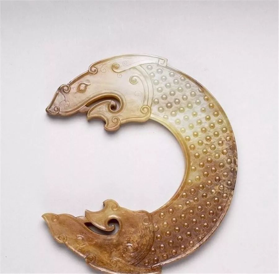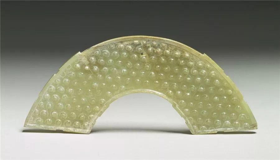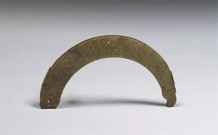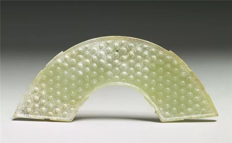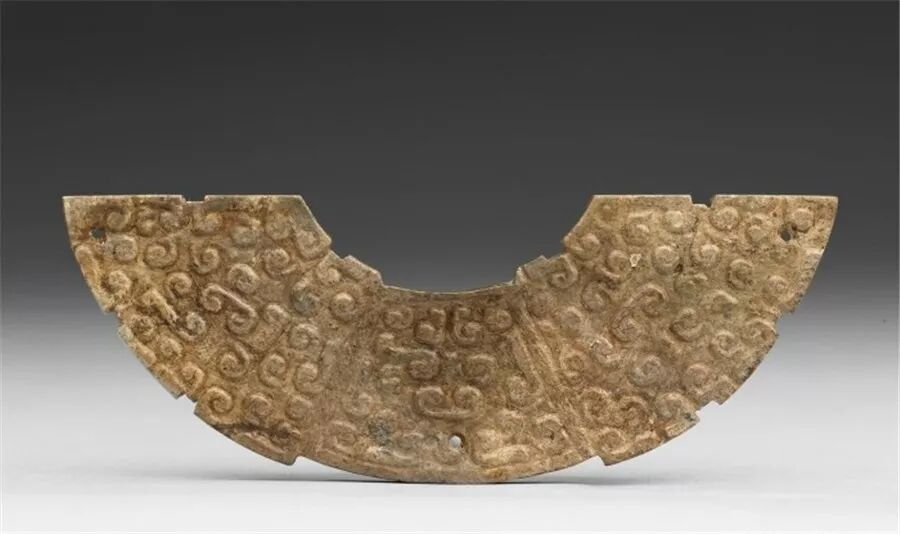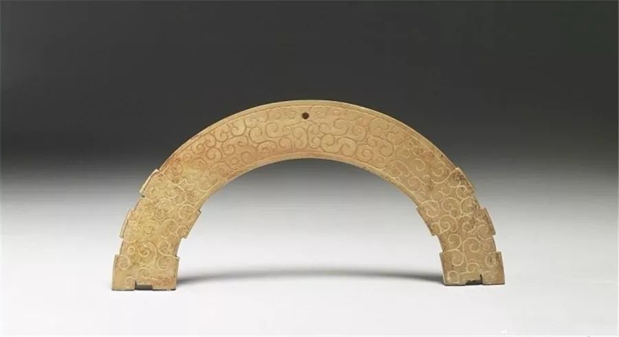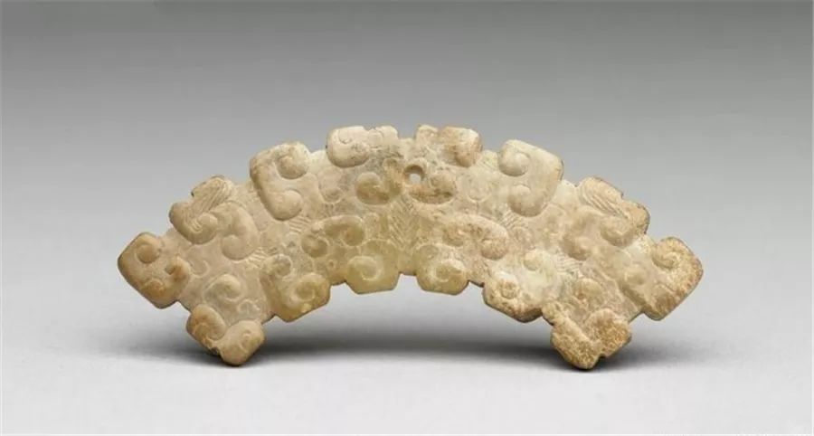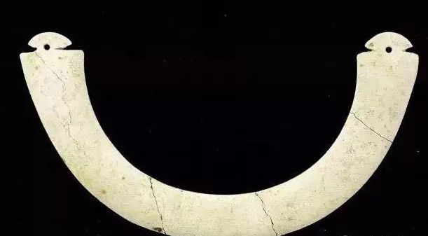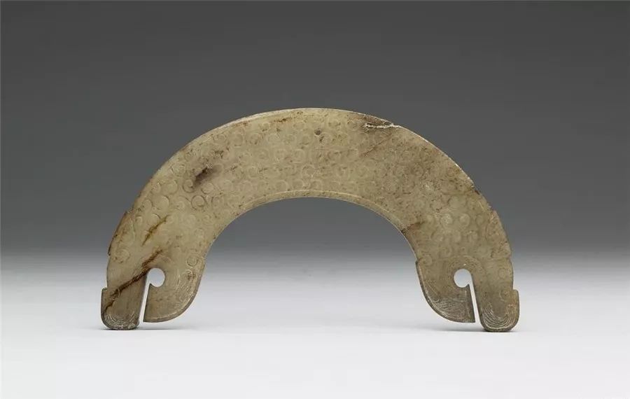 玉璜最早见于新石器时代中期的仰韶文化、大溪文化、崧泽文化遗址中,形制有扇面形、半环形、桥形、半月形、近半月形、近半圆形、条形等,不一而足,两头各钻二孔,均为素面。