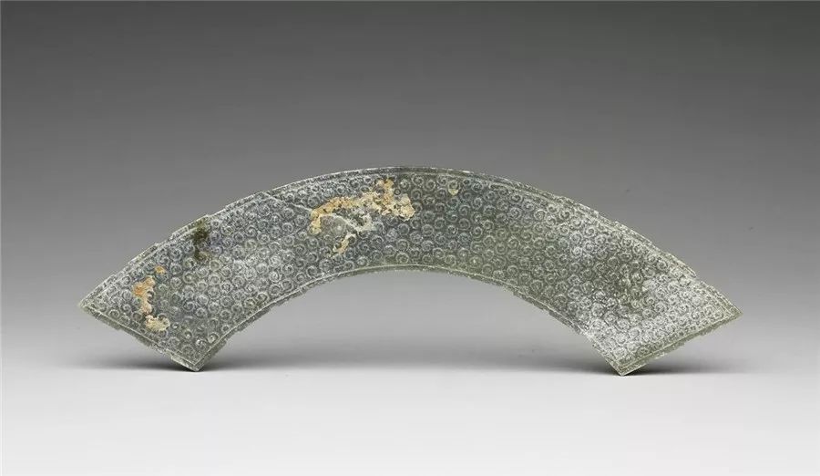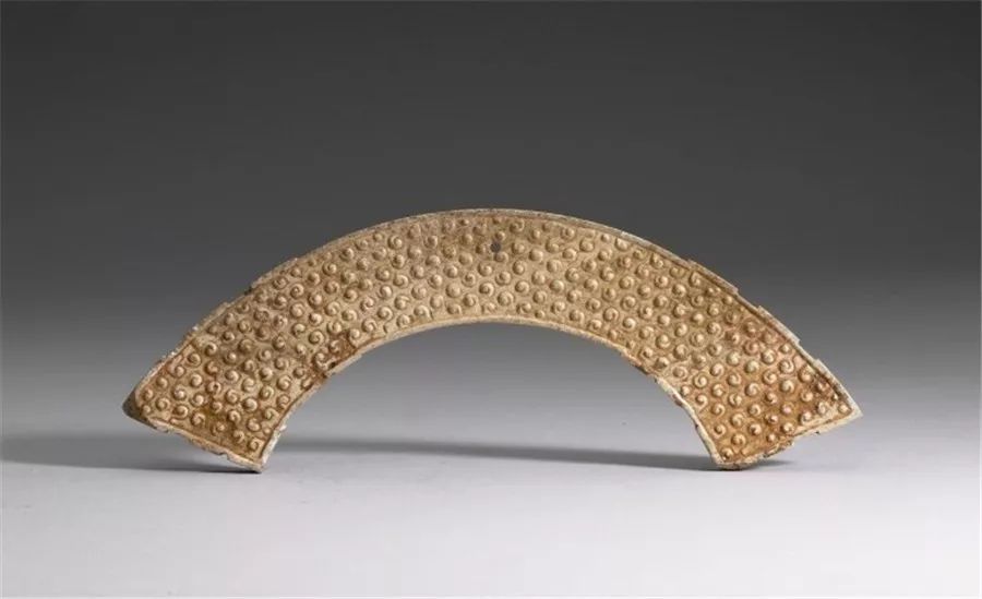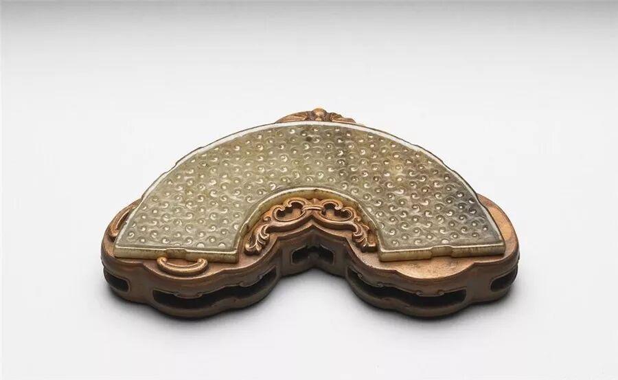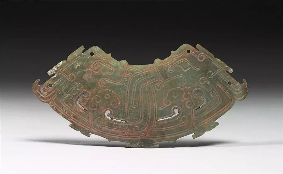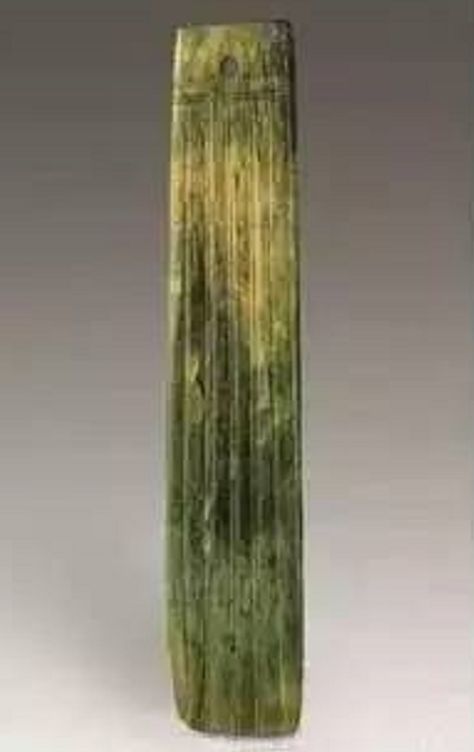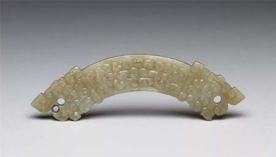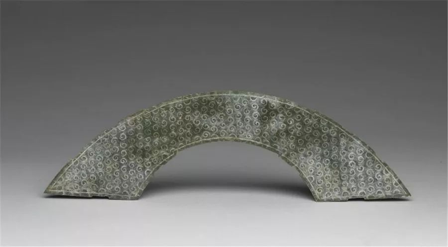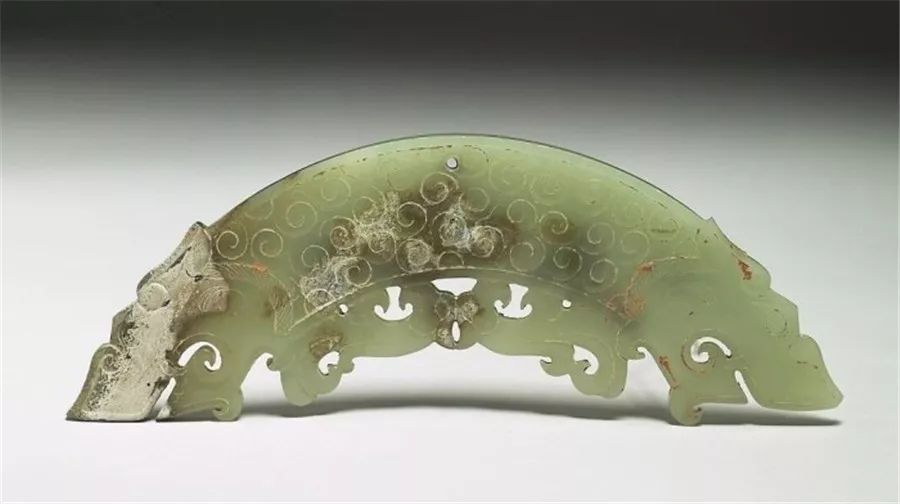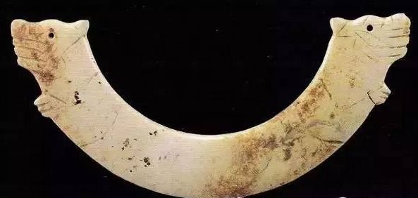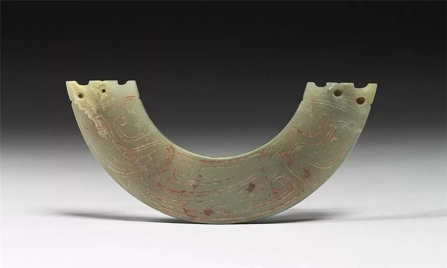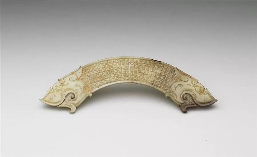 玉璜最早见于新石器时代中期的仰韶文化、大溪文化、崧泽文化遗址中,形制有扇面形、半环形、桥形、半月形、近半月形、近半圆形、条形等,不一而足,两头各钻二孔,均为素面。