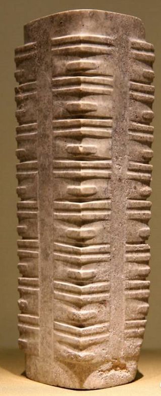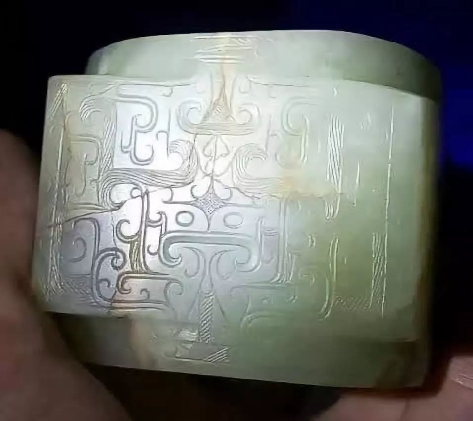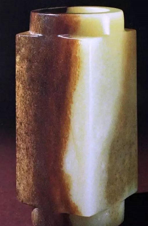 新石器时代发现较多的良渚玉琮,玉材为产于江浙一带的透闪石质玉石,质地不纯,以青色居多,部分黄色,土浸后呈雾状乳白色。除少数作圆筒状外,多制成规整的内圆外方形。琮体切割规整,中孔为管钻对穿而成,中接处常留有两层。玉琮的形体大小高低不一,一般早期矮,晚期高。琮身均饰有兽面纹,纹饰以四角线为中心,分成四组,随琮高低不同,以相同的纹饰分数组饰于琮上。部分玉琮在主体兽面纹外,用细阴纹刻细“神人”图形和云雷纹,阴线用利石刻划而成,线条坚挺。浙江杭州反山遗址出土的神兽纹玉琮为现今所见良渚文化中最大的玉琮,被称为琮王。![]()