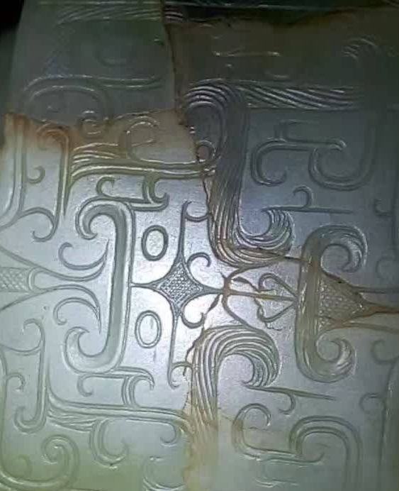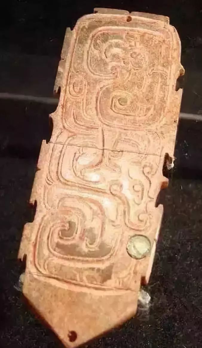 长10.3厘米,宽3.8厘米。1992年曲沃县北赵村晋侯墓地31号晋献侯夫人墓出土。置于墓主人腹部,已沁呈褐色。双面刻有形制相同的凤鸟纹和龙纹。凤鸟有冠,弯喙,圆眼,展翅,尾羽上卷,蟠曲回旋至凤喙,凤爪置于龙身;龙身蟠曲,卷鼻,臣字目,吻前有一穿孔,内嵌绿松石。纹饰多以斜切线和较细的阴线相配合的技法,勾勒双线轮廓,颇为精致。![]()