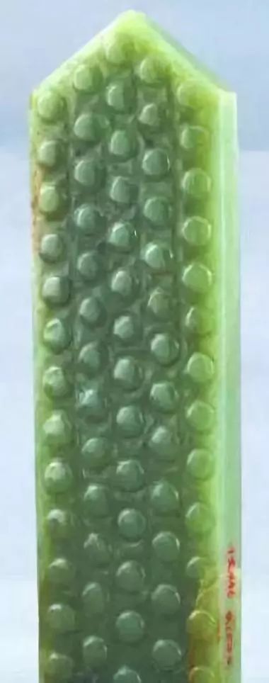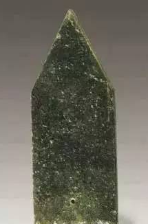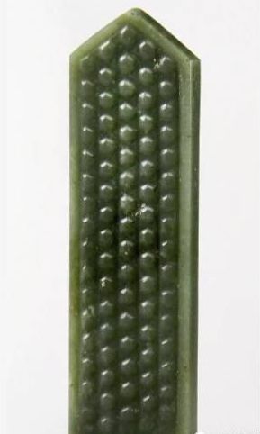 目前发现的秦汉六朝的礼仪用玉中,玉圭相对较多。其形制基本一样,以青玉制作,均尖首、折肩、平底、素面,多无孔,西汉中期有在下部穿一孔者。秦代玉圭除西安联志村的以外,在山东烟台芝罘原阳主庙后殿前秦代祭祀坑中也出土有两组青玉器,其中有圭,放于璧孔中央,可见玉圭是祭祀时必用之器,西汉以后玉圭发现较少。秦代玉圭(图1)长7厘米,宽1.5厘米,和田青玉。![]()