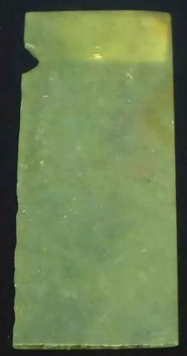 条形,未开刃,一孔。一侧有半圆形凹缺,近凹处有一长切痕,完整。此件玉圭小巧,有已用功能,有改制痕迹。