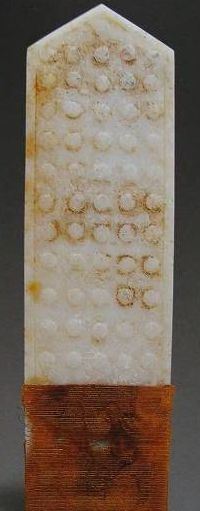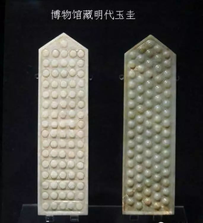 为西汉礼仪用玉。长7.1、宽2、厚0.2—0.4厘米。两件,青玉质,玉中有黑点,扁平状,长方形出尖。此器出于棺室内,同出还有钺形穿孔青玉片,应同为礼仪用玉。此种形制玉圭在山东巨野红土山西汉中期墓中也有出土。 明清时期出土玉圭 在明代冠服制度中,皇后、皇妃、皇嫔、皇太子妃、亲王妃、世子妃、郡王妃礼服均有“玉谷圭”一件,即瑑有谷(穀)纹的玉圭。明神宗定陵和各地明代藩王墓出土过多件玉谷圭实物。![]()