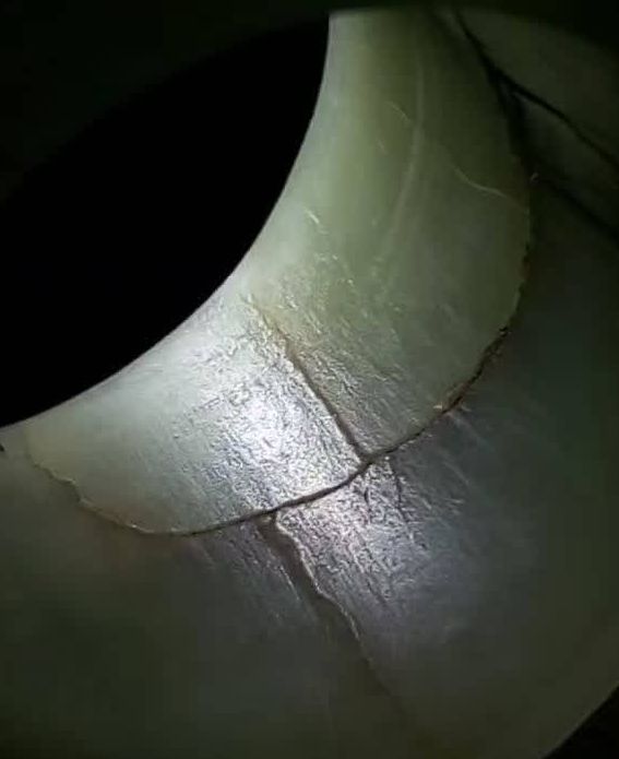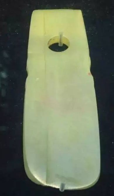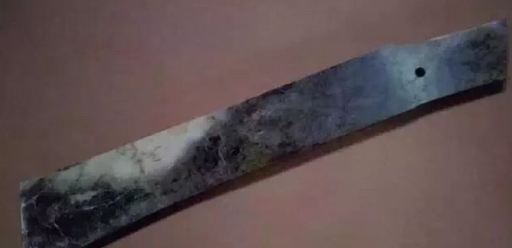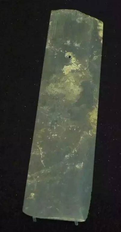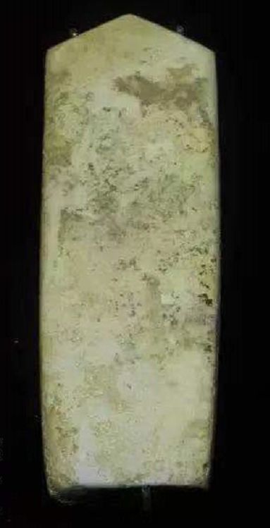 扁平体长形,一孔。底残缺,首薄。此件玉圭较厚实,相比较实用性较强。