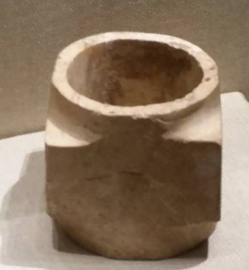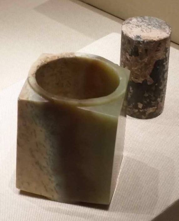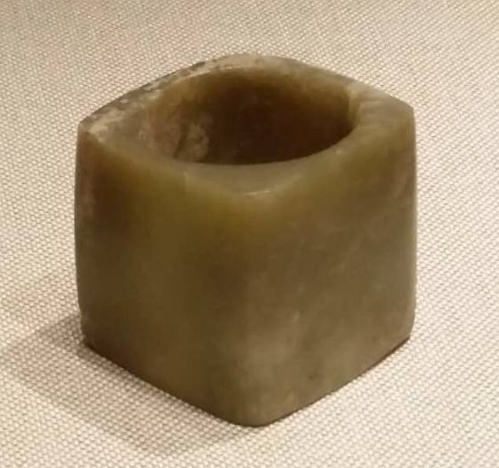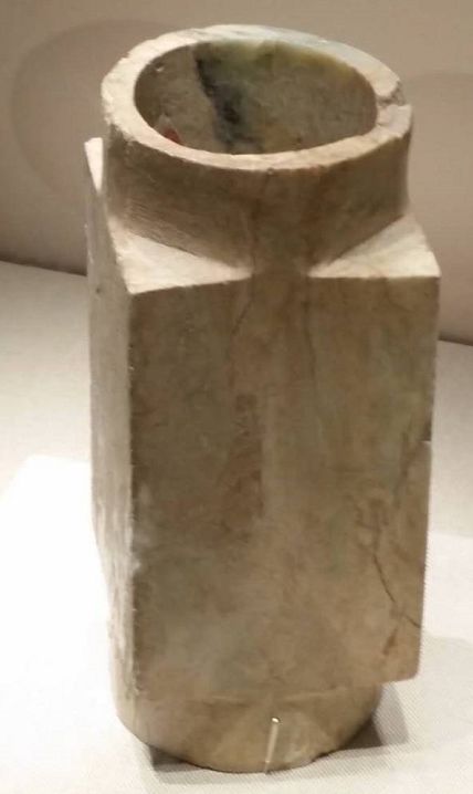 距今5100年,与良渚文化同属新石器晚期。这件玉琮高2公分,宽1.8公分,射径0.8—0.9公分。这是目前所发现的最早的玉琮,此时的玉琮形体较小,制作工艺较为简单。其造型略呈方形,中部有一圆形直通孔,外部四角凸起,四角中部各有一横切割的缺口,将凸起部分分成上下两节,琮的四个面,各有一竖直沟槽,使琮的四面形成了八块,此乃“外八方象地之形”也。琮的棱角圆润,玉的表面沁成了鸡骨白色。薛家岗文化玉琮与良渚文化玉琮相比,其制作工艺不可同日而语。