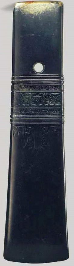玉料表面经染色呈漆黑色,器身扁而长,一端略宽,有刃,另一端有一孔。圭两面皆有纹饰,一面中部为阴线兽面纹,兽面的上、下方分别饰阴线绳纹及成组的凸线,另一面的主体纹饰同前一面大体相同,下方有一组凸线构成的变形兽面纹。目前为止,考古发掘中尚未发现有类似凸线纹饰的玉圭,对这件玉圭的制造年代,学者多有推测,一些学者认为,玉圭应为新石器时代晚期的作品。