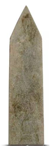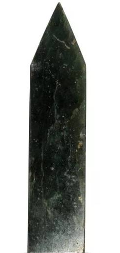 阳起石软玉,边缘半透明,器表抛光。顶端稍宽于柄端,顶缘近似弧刃,但中部出一突尖,形成不甚明显的、两腰呈弧线的三角形。两侧单面刃。墓中纵向平置于墓主头骨右侧。