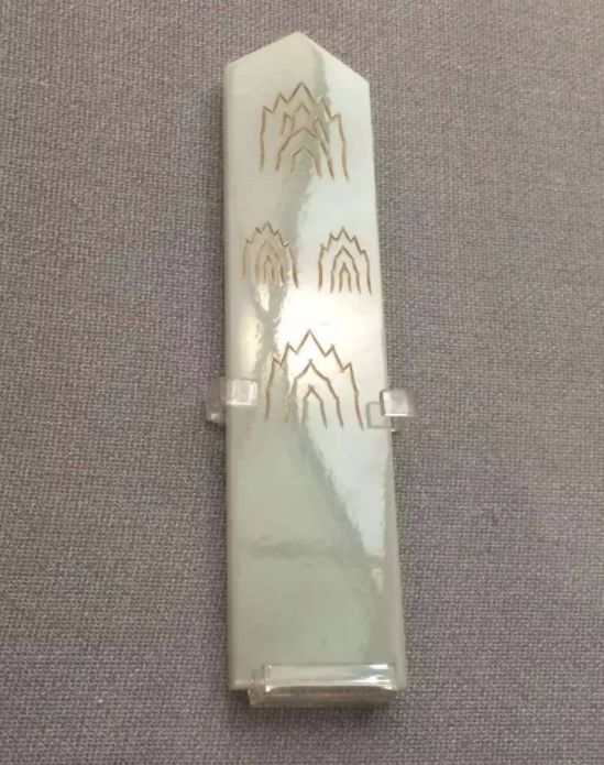 软玉。顶端呈等腰三角形,宽于饼端,两翼稍薄,磨成钝刃状,两侧尝遍斜收,底边平直。顺向平置于死者胸腹间,尖端朝向墓主足端。
