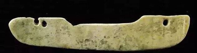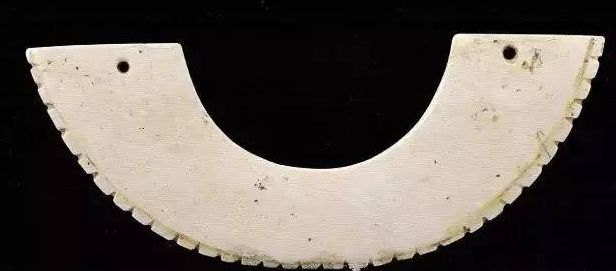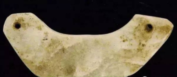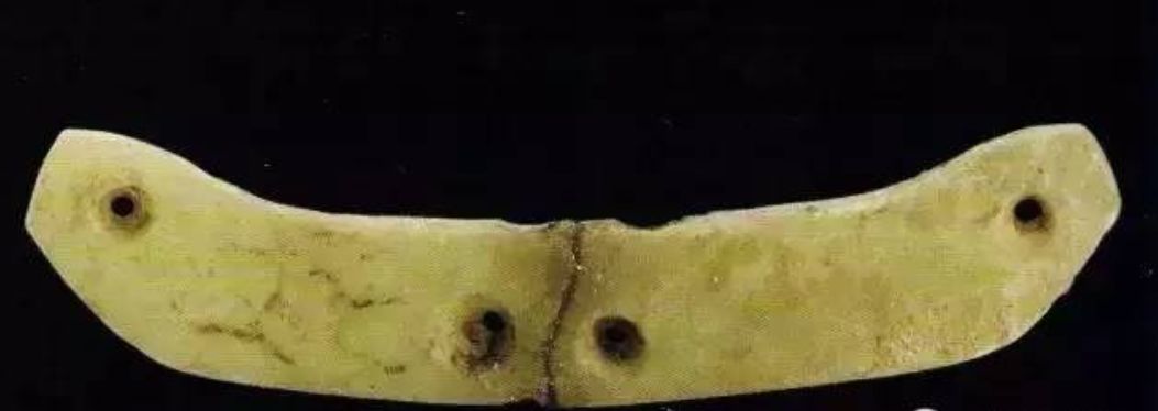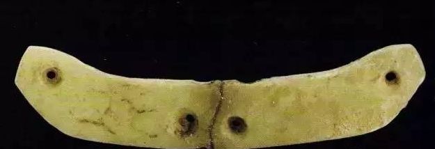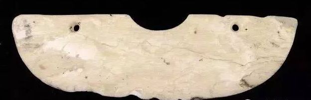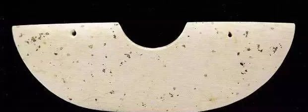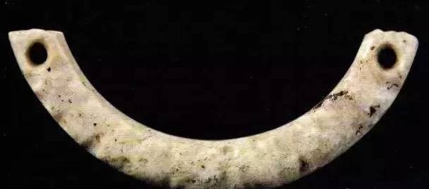 扁平半月形,两端各钻两孔,孔缘有系挂绳索的磨勒痕迹,出土于墓主人的颈部。