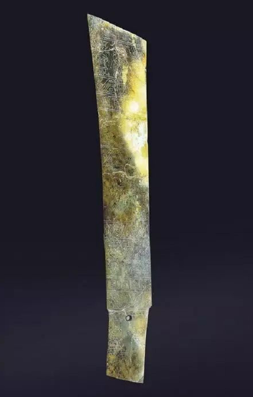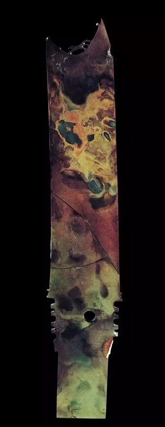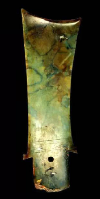 体扁长,一边平直,一边有刃。低圆弧形有孔。首有刃,一面近底部有划痕。边残,此件玉圭兼有实用和礼器作用。