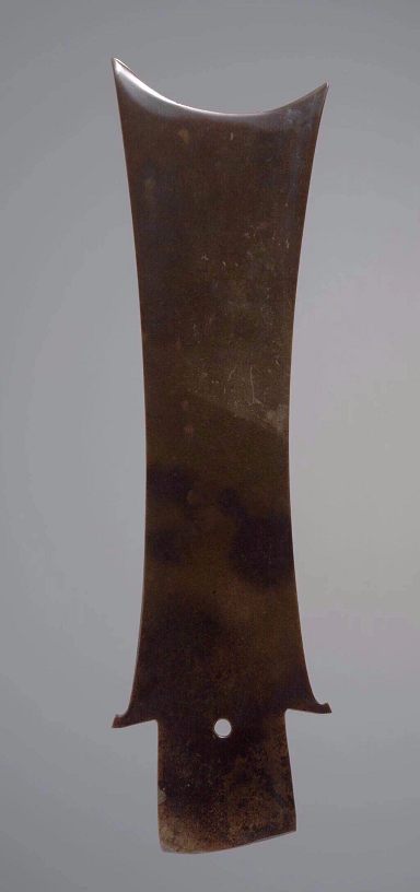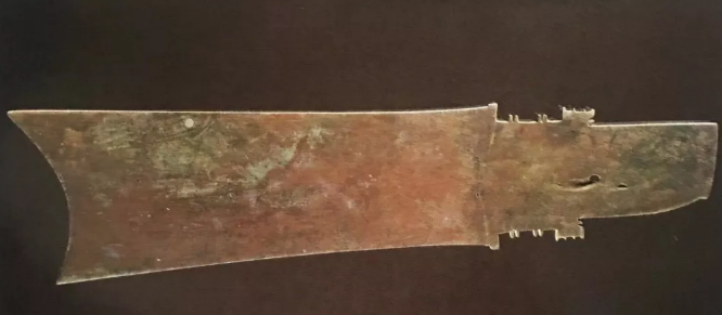 牙璋器形大體呈扁長條形,方形邸,射部頂端為斜刃或者凹刃,兩尖斜出自然而不對稱。射本處有齒狀扉棱。