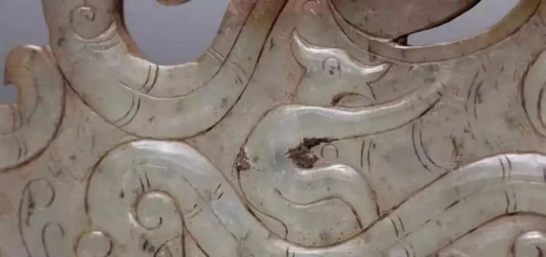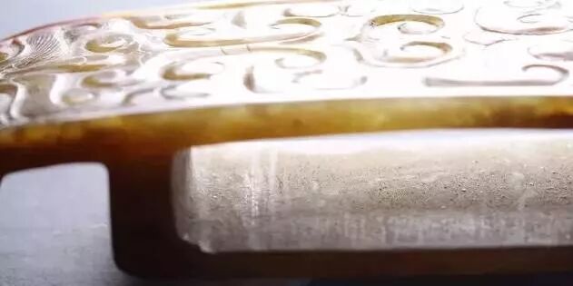 汉代玉剑饰的镂空部位特征,拉丝痕迹+打磨痕迹+自然风化形成的皮壳特征。