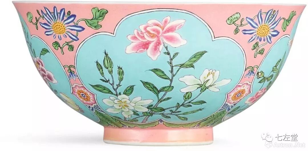 清康熙 粉紅地琺瑯彩开光花卉碗