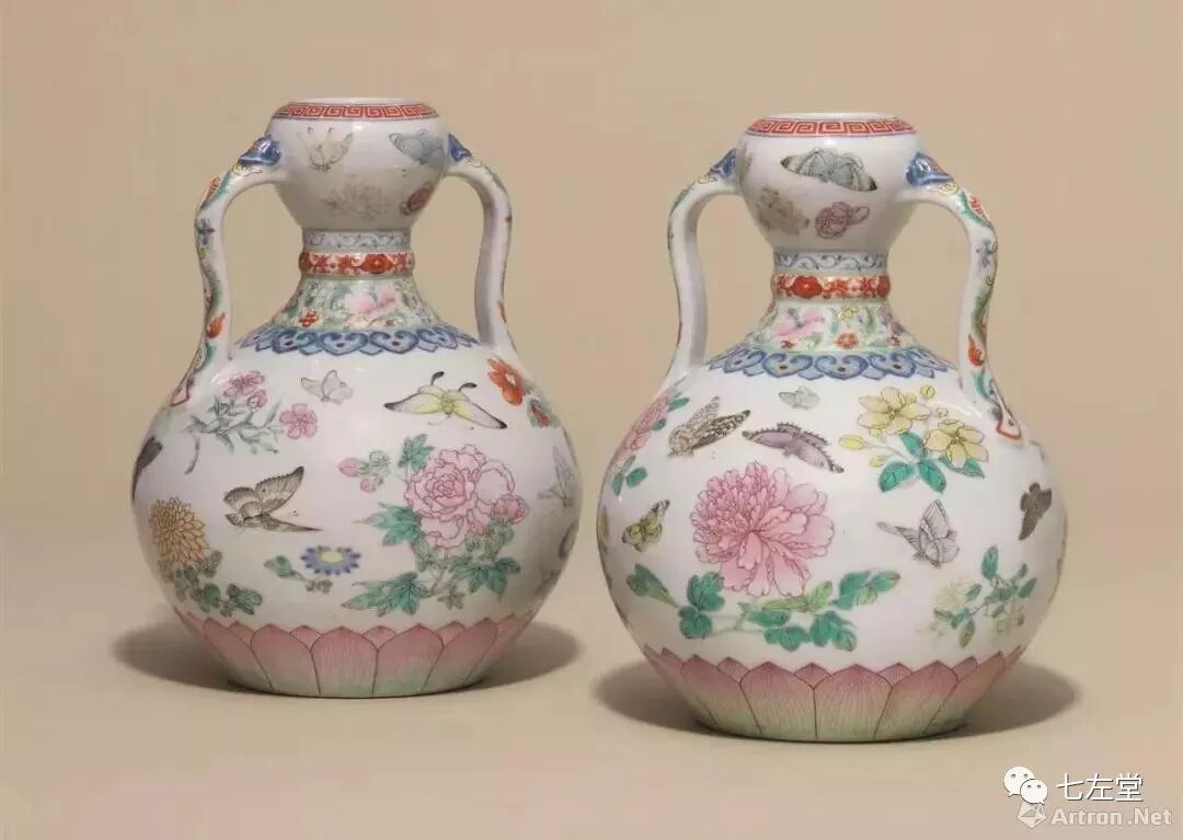 清乾隆 粉彩花蝶纹如意耳葫芦尊一对