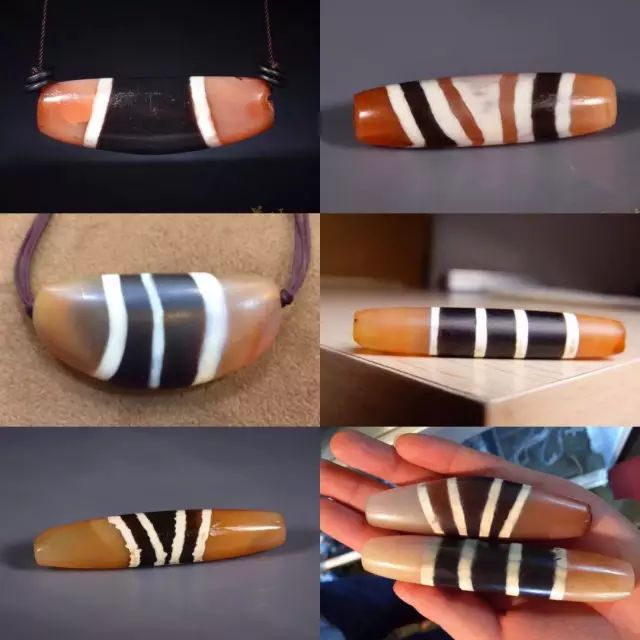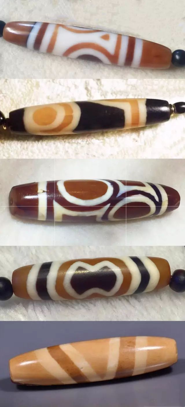 3.孟加拉系三色珠。孟加拉系蚀花珠是近年在各种资料日渐丰富的情况下,收藏家和珠商根据实践和长期积累的经验总结出来的一个类型。孟加拉蚀花珠的工艺、材质、装饰风格和珠子的器型都区别于其他蚀花珠系列,其质感较接近瑟珠系之至纯天珠。孟加拉的蚀花珠包括三色珠和双色蚀花珠,三色珠是其中的特殊类型(图4.)。