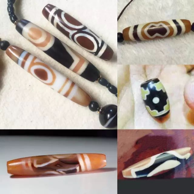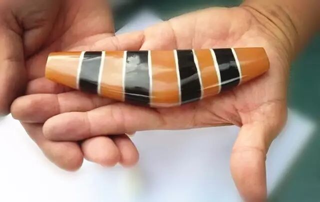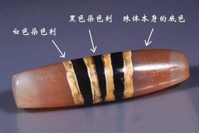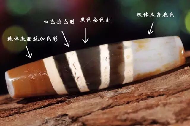 措思珠的制作工艺比较多样,较至纯天珠有更多染色选择,除了整珠白化,还有“黑化”和“糖化”(棕色染色)乃至其他更少见到的颜色。理论上任何色彩都是可以选择的,这取决于工艺的可能和习惯(或文化)的选择。三色措思便是在珠子被施加蚀花图案之前就经过整体改色的流程,之后又使用两种色彩对珠子施加图案,与珠子的人工底色一起构成三色装饰效果(图11.)。