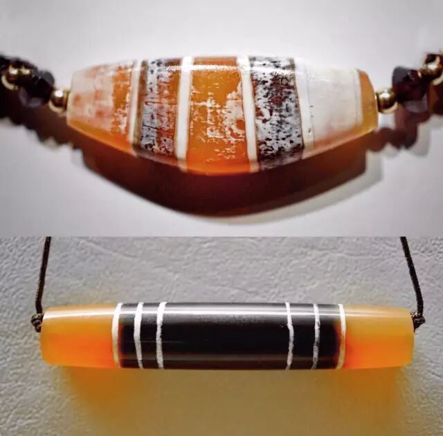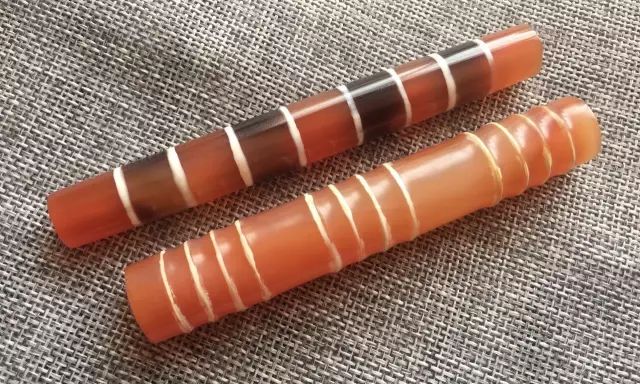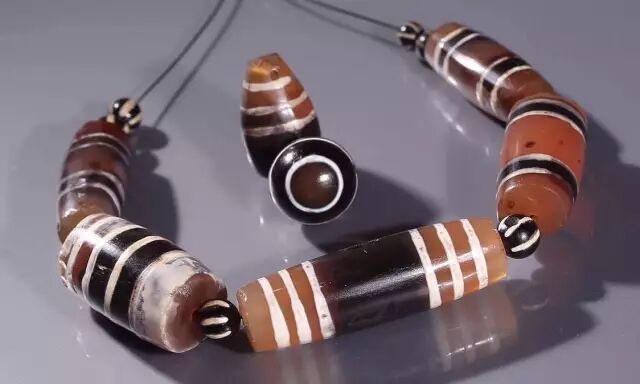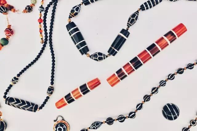 需要说明的是,所谓珠体本身的底色并非天然,肉红玉髓在被制作成珠子前,原石大都经过加热处理,用意将原石中所含铁元素经高温氧化还原,以使得石头呈现更加鲜艳的红色。这一工艺流程未使用染色剂将石头改色,而是利用石材本身所含矿物元素进行加色处理。早在公元前2500年的印度河谷文明时期,当地工匠就已经采用这种加色工艺。