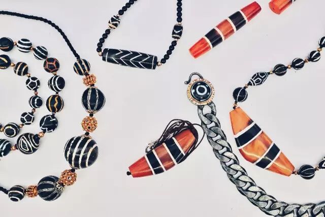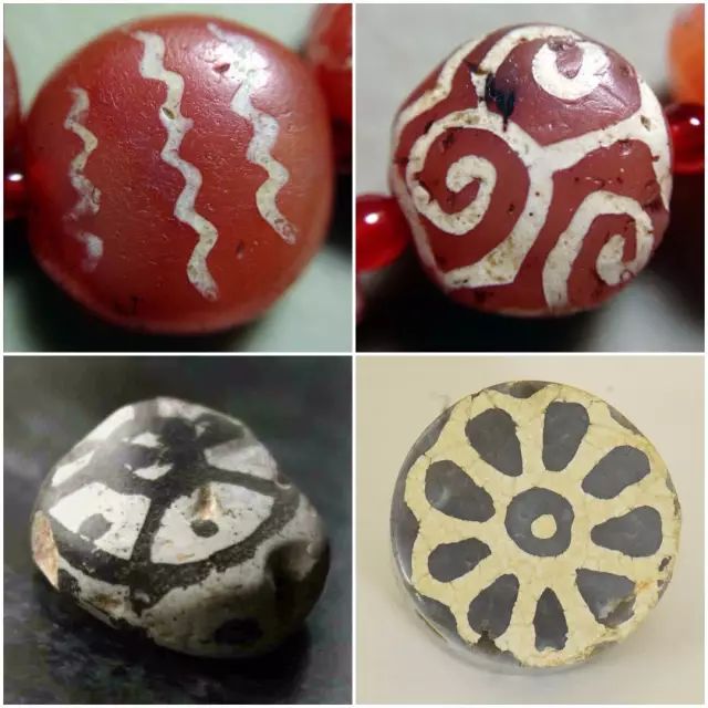 艾宾豪斯先生(见作者《喜马拉雅天珠》一书)则在以上二种工艺类型之外又演绎出型三,即在天然石头(红玉髓)上同时施加黑色和白色两种染色剂画花,与未经染色剂覆盖的(天然底色)部分一同构成珠体表面图案,其图案呈现三种颜色,即黑色、白色和天然底色。这种工艺大多为尼泊尔线珠和东南亚三色珠采用,不同的是,这两种系列的蚀花珠采用的材料、工艺流程和染色剂配方不同,因而最后呈现的色彩效果不同(图09.)。