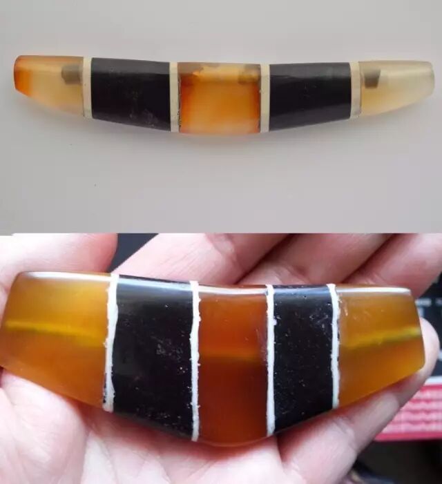 羊角形珠的形制早在公元前3000年前后就已经出现,推测最早的羊角珠形制确与羊角(或牛角)有关,最初很可能是对拥有财富(牛羊)的一种骄傲的表达,后来演变成抽象的符号用于装饰和象征。这种以牲畜角状为蓝本制作珠饰的传统至今仍可在某些部落社会见到。
