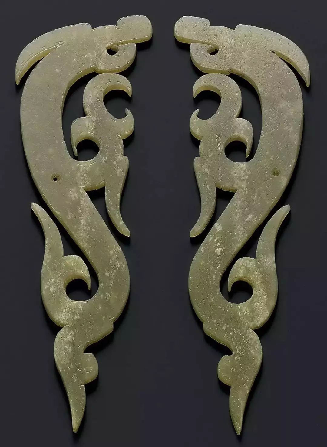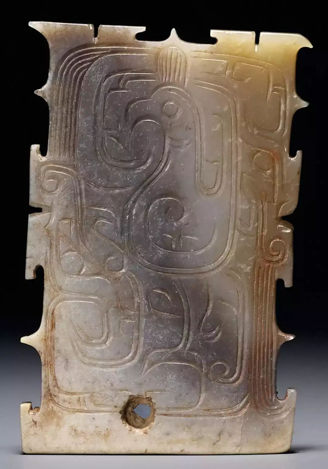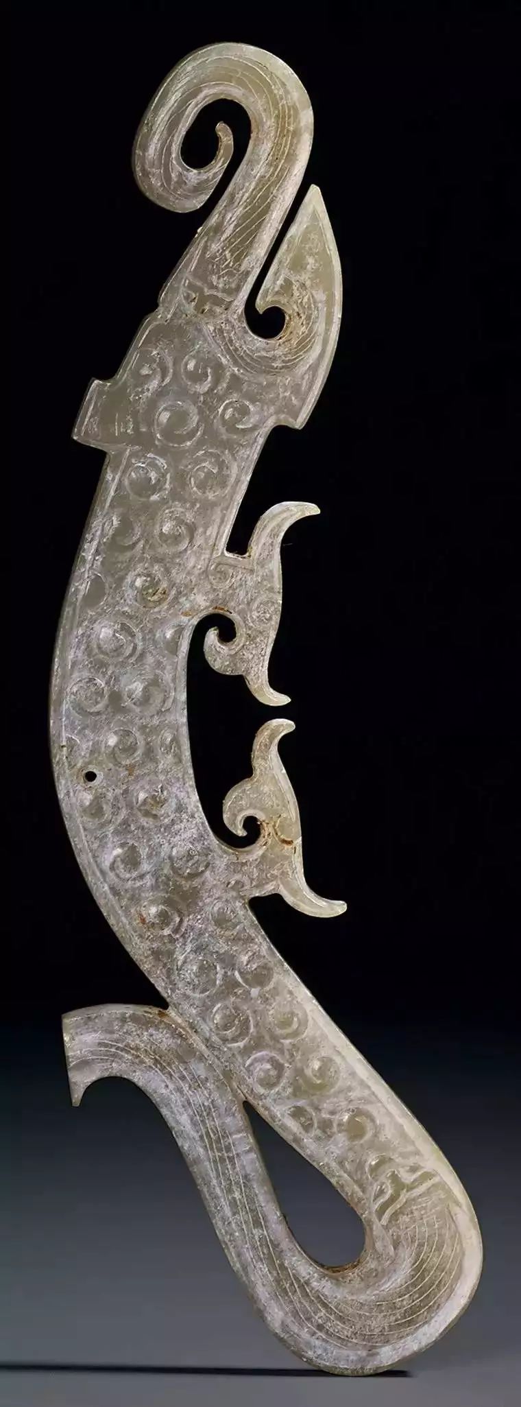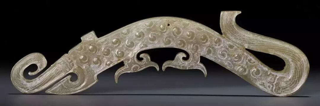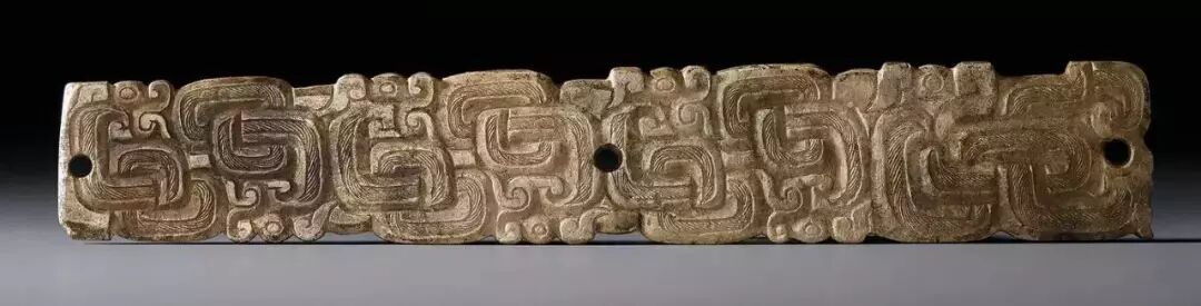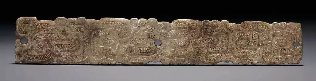 扁平体长片状,周边琢出对称齿脊,两面浅浮雕蟠龙纹七组相绕,头部刻划精细,圆目张口,上唇上卷与鼻相连饰勾云纹,龙双身躯线条蜷曲相连,雕琢极细的细线纹和卷曲的勾云纹。整体纹饰繁复,造型精美,体现制作者丰富的想像力。器身正中间钻孔,以供系佩,近两端边缘各钻一孔,以便垂饰其他玉饰。![]()