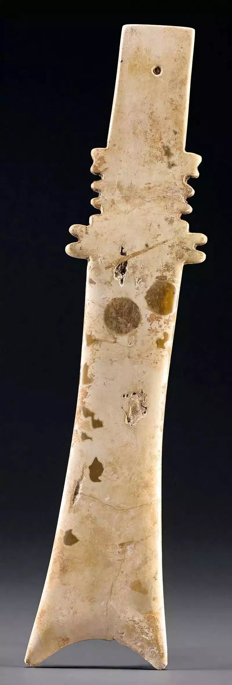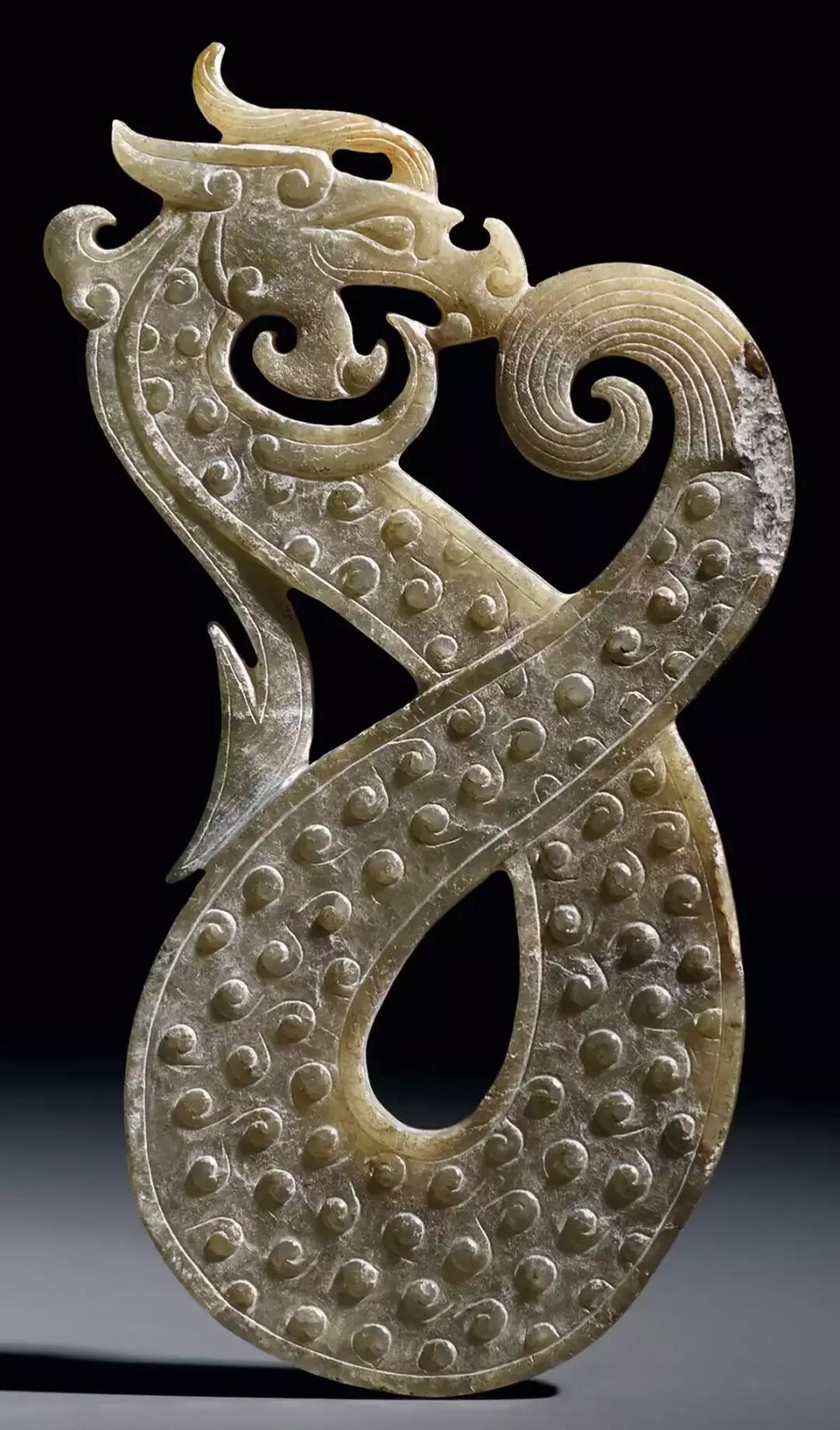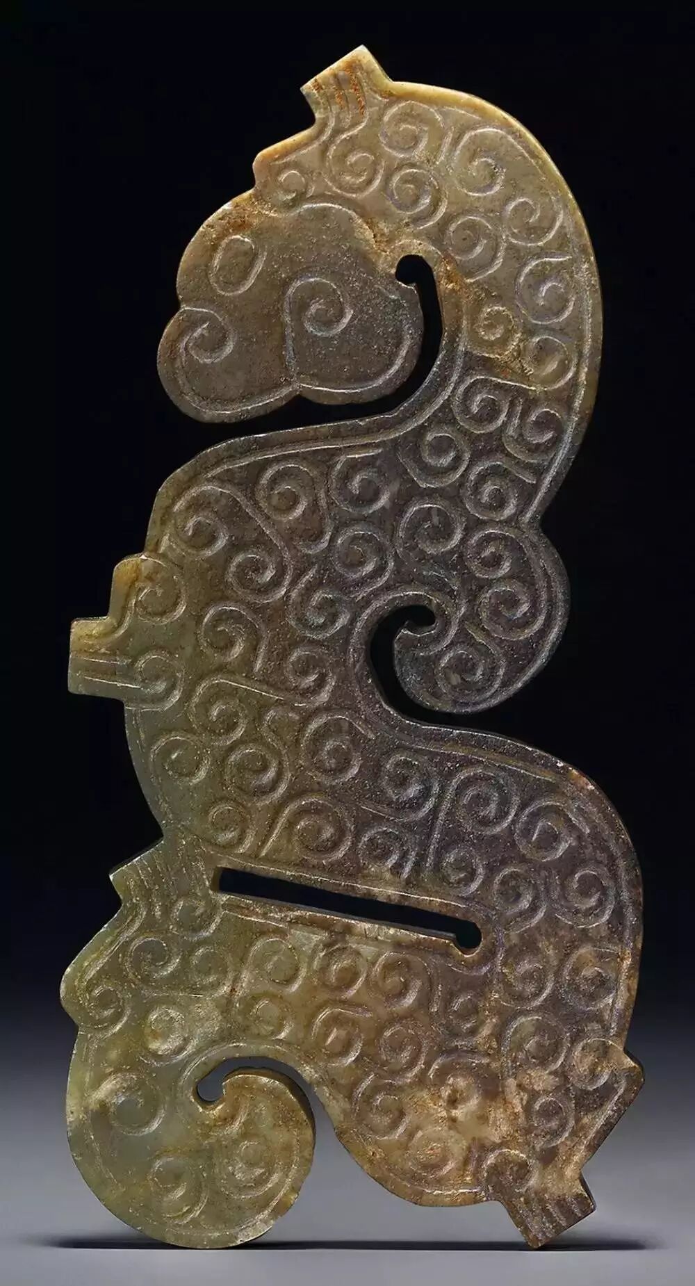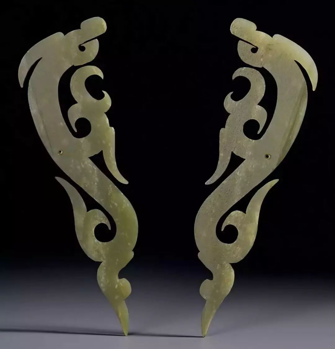 扁平体长片状,周边琢出对称齿脊,两面浅浮雕蟠龙纹七组相绕,头部刻划精细,圆目张口,上唇上卷与鼻相连饰勾云纹,龙双身躯线条蜷曲相连,雕琢极细的细线纹和卷曲的勾云纹。整体纹饰繁复,造型精美,体现制作者丰富的想像力。器身正中间钻孔,以供系佩,近两端边缘各钻一孔,以便垂饰其他玉饰。![]()