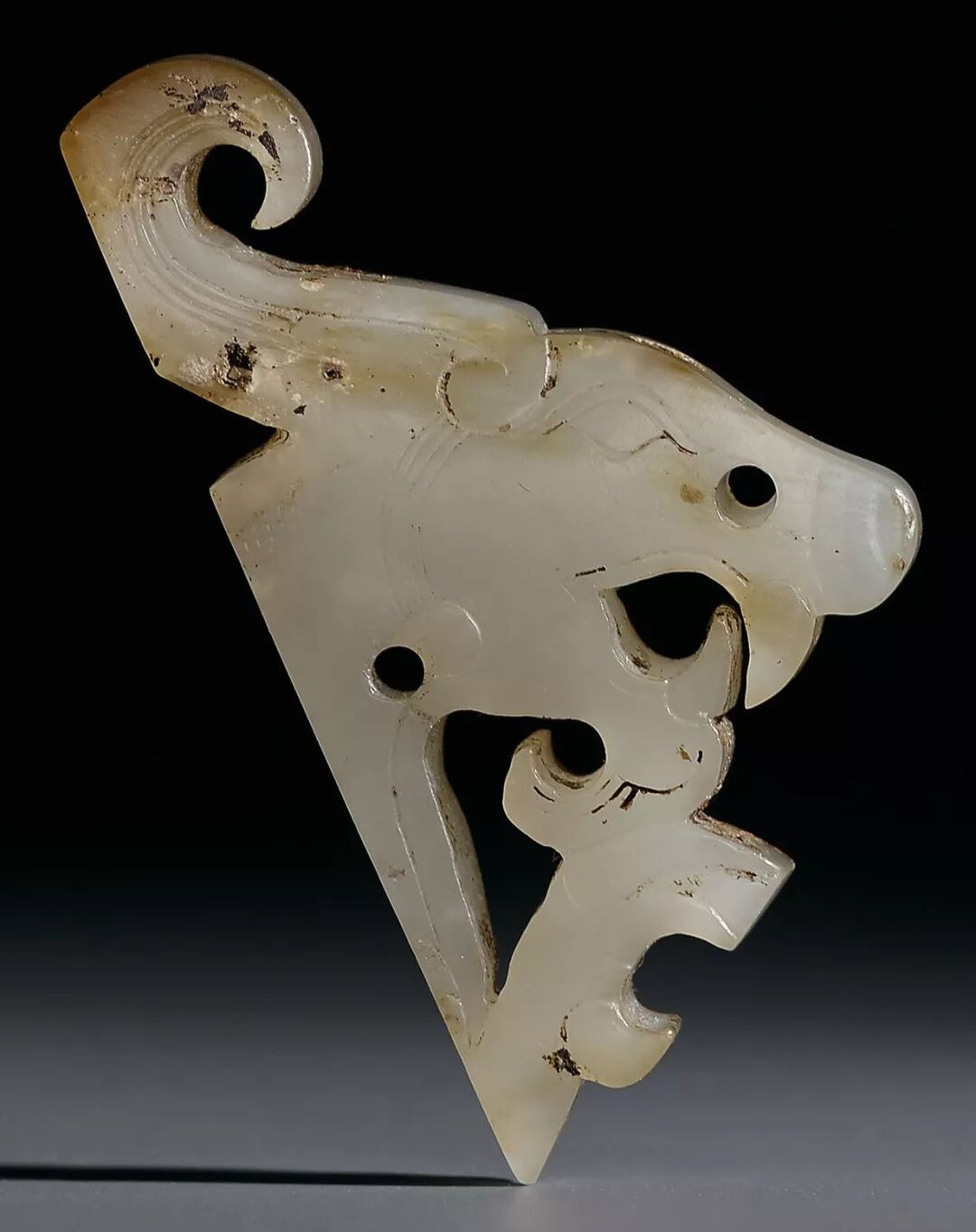 本件龙形佩是战国时期玉龙的典型形象,造型规整,刚劲俐落。其边角线规矩见锋,透雕内部磨光,刻细微处如发丝,纹饰华美,改变先前单调图案化之纹样,展现横空出世的灵性和霸气姿态。