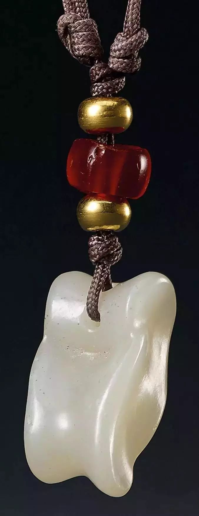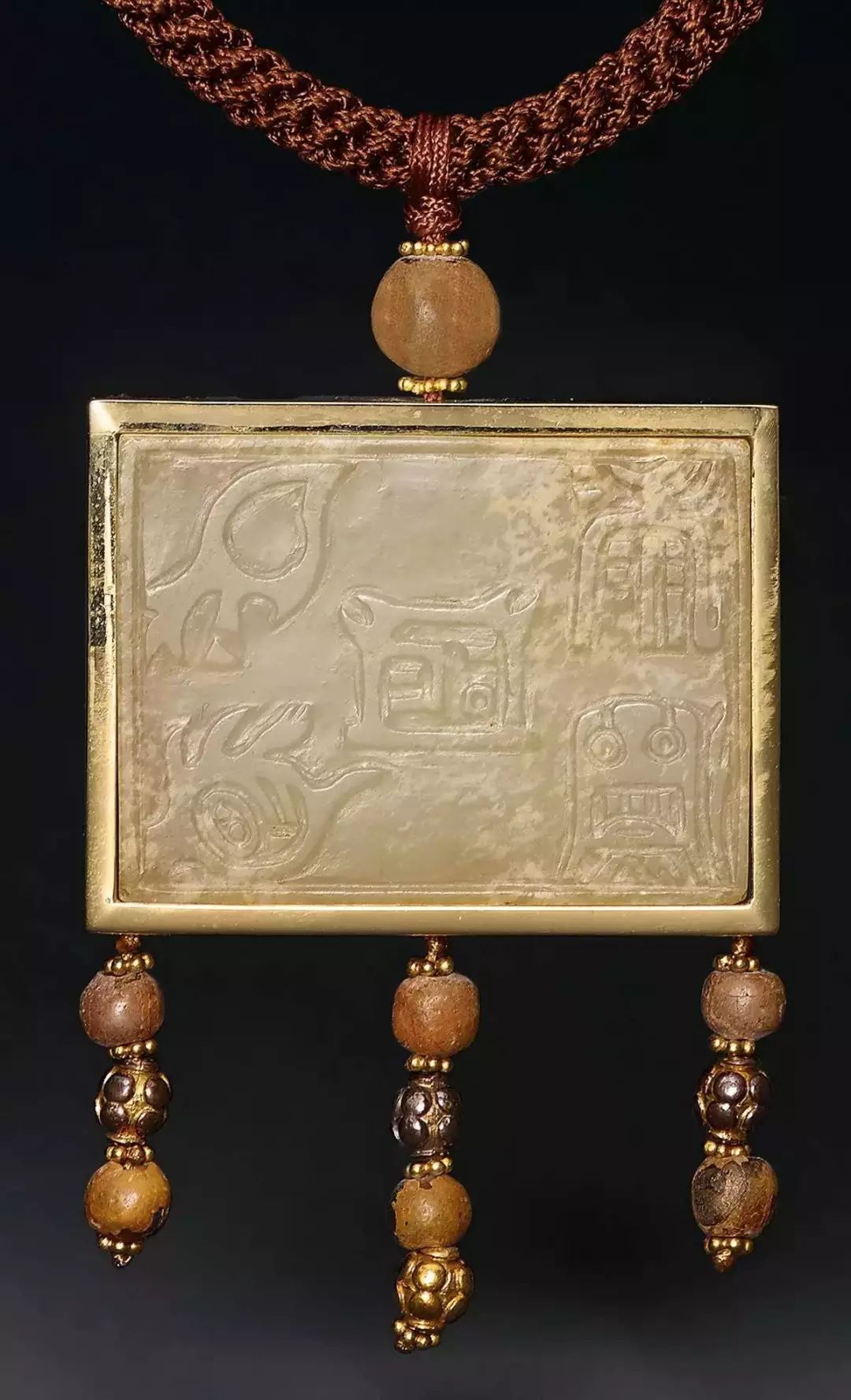 “亚”字形玉片非常罕见,张抡《绍兴内府古器评》一书中所述:“凡器之有亚形者,皆为庙器,盖亚形所以象庙室耳。”五件亚字形玉片,代表五世宗庙。本组佩饰以五件亚字形玉片镶金框,即表“五世其昌”,赋以繁荣昌盛的吉祥寓意。![]()