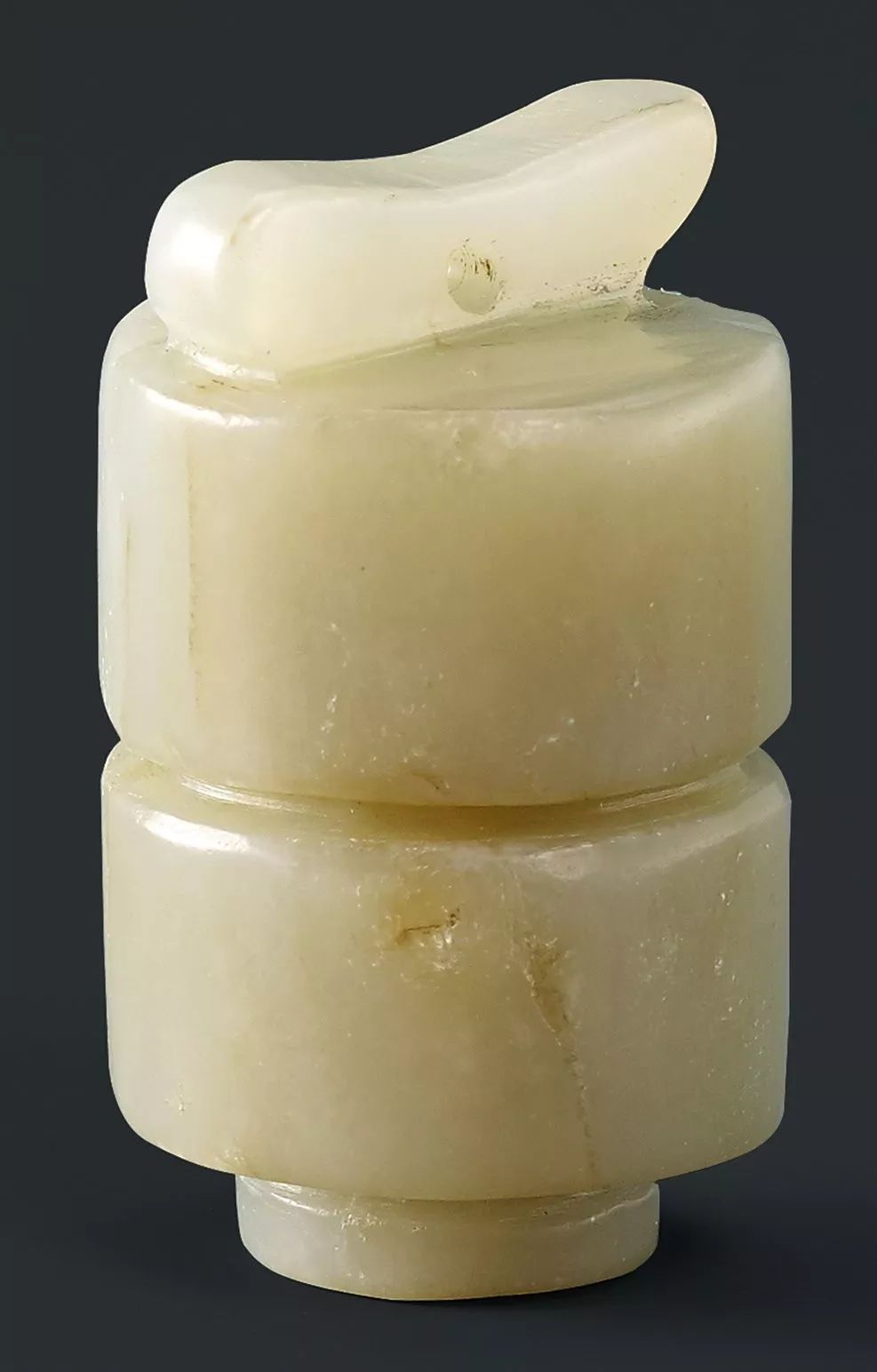 二件取同一玉料琢制成,双面皆浅浮雕饰卧蚕纹,亦即谷纹,在谷纹之间的器表,留下制作时打格子条痕,刀法线条刚硬,线条简练挺拔,张驰有力,此类风格属战国晚期至西汉中期之作。![]()