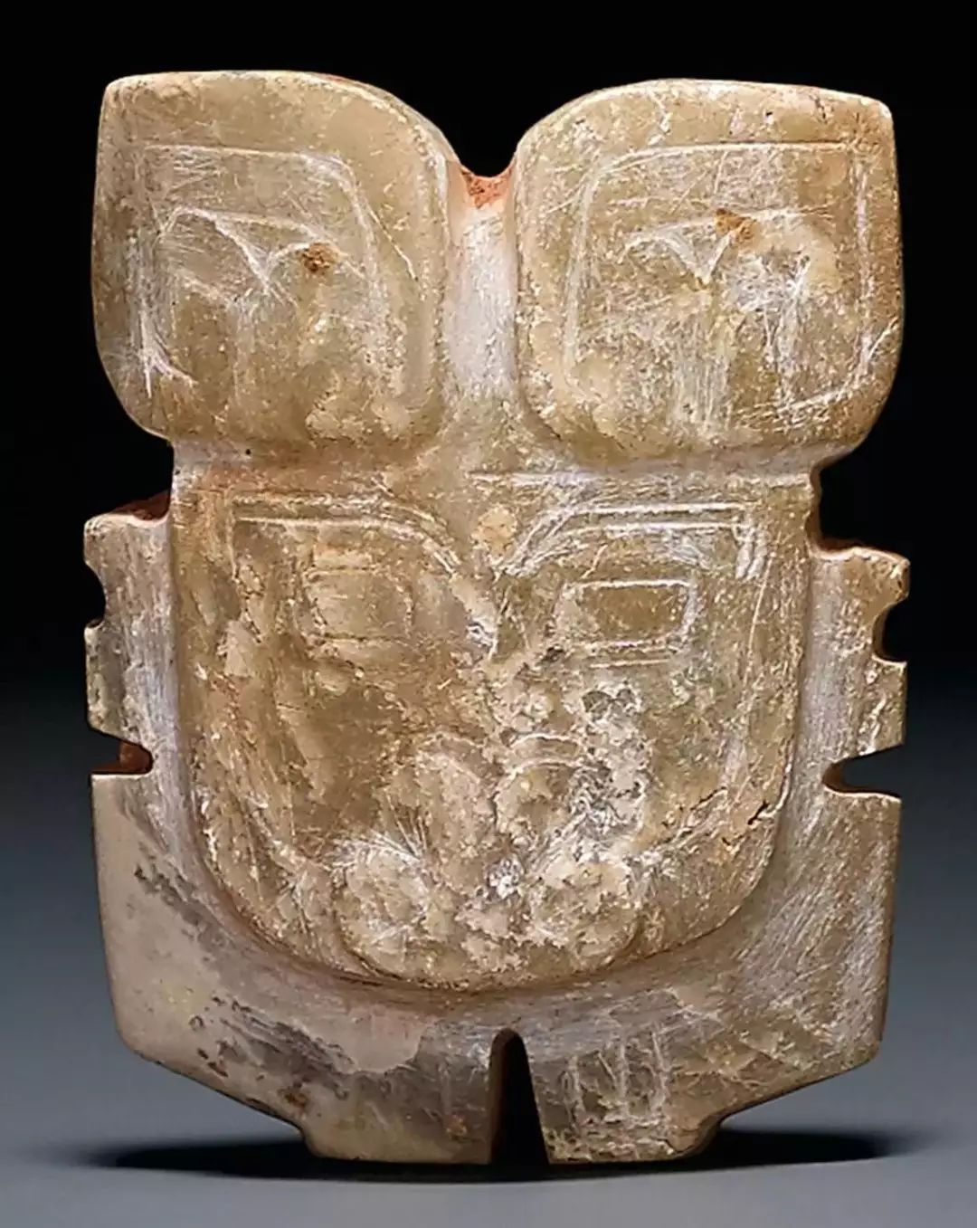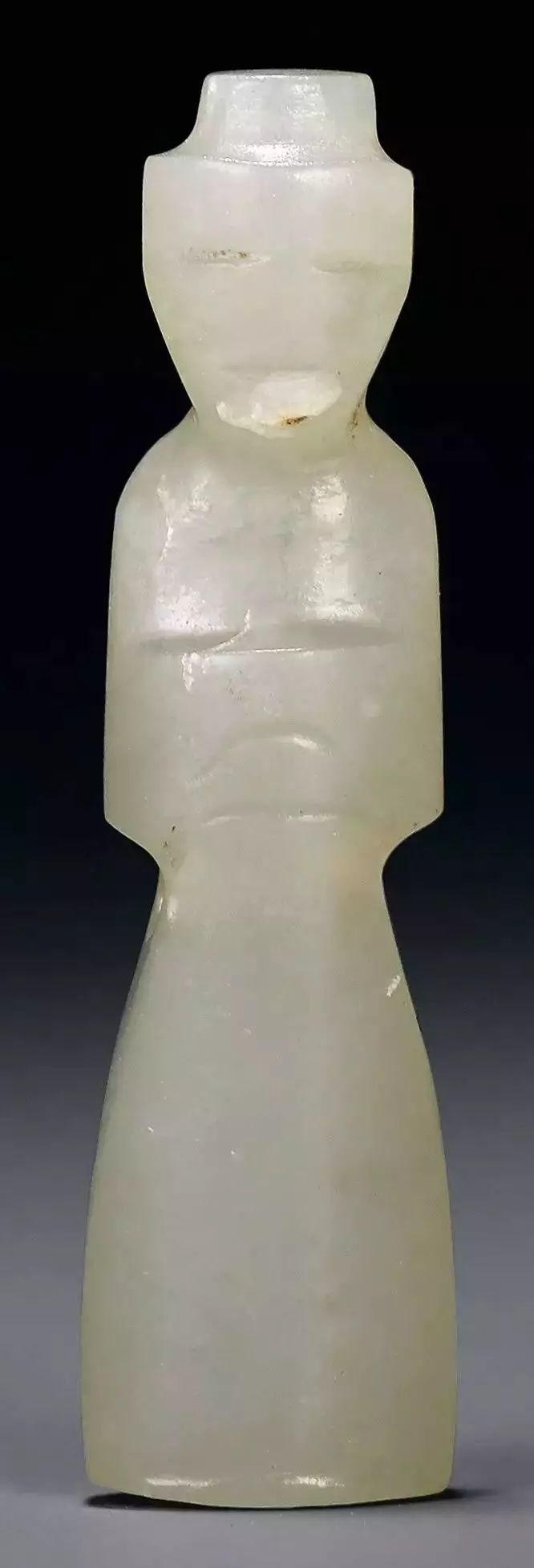 玉雕人面、人首最早始见于新石器时代的石家河文化,有学者认为,史前出土的一些玉人面和良渚文化玉器上的“神徽”,不是神人像而是巫觋像,是巫觋通神时佩戴之用,以玉事神。![]()